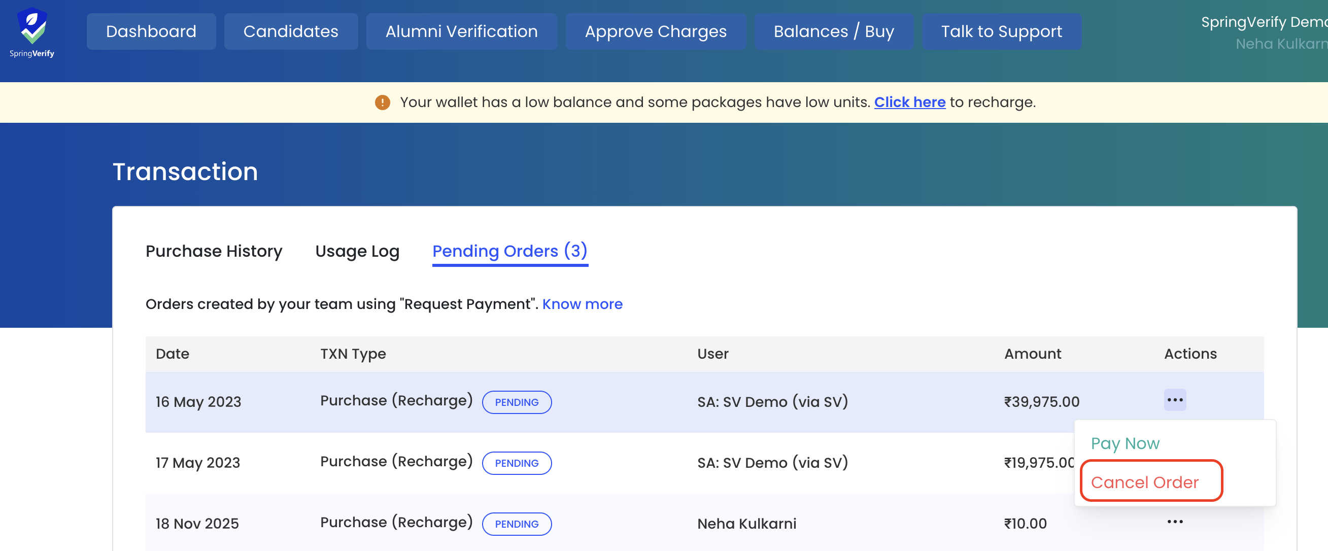 Locate the pending order and click on the three dots under the "Actions" column.