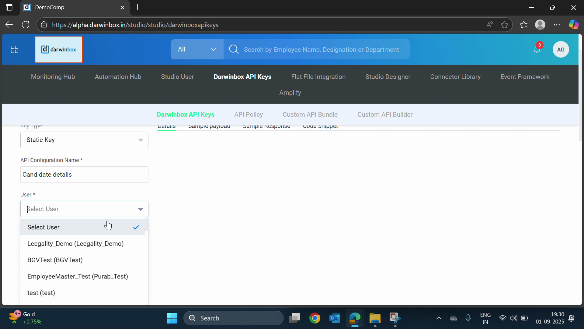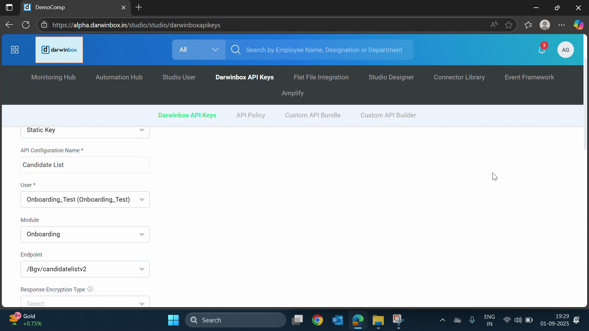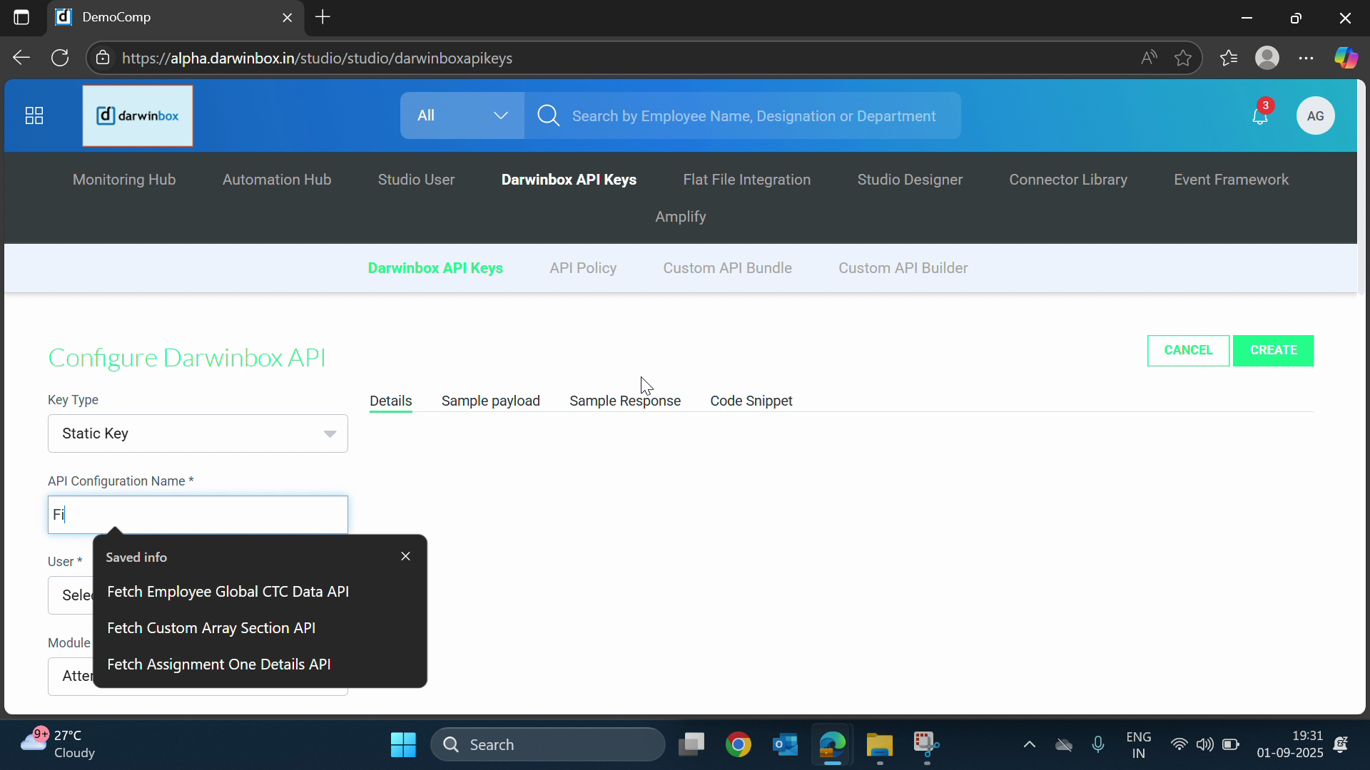 8: Select the user that you've created as the studio user. The module should be onboarding and the endpoint should be candidate list feed. Click on create.