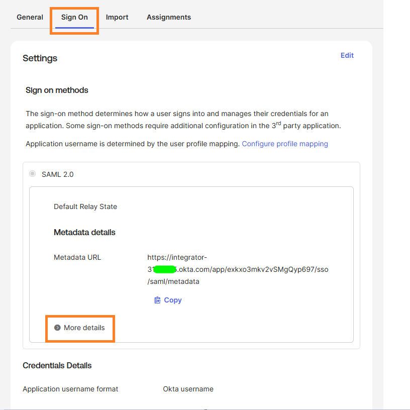 In the newly created SpringVerify app, open the Sign On tab and click on More details