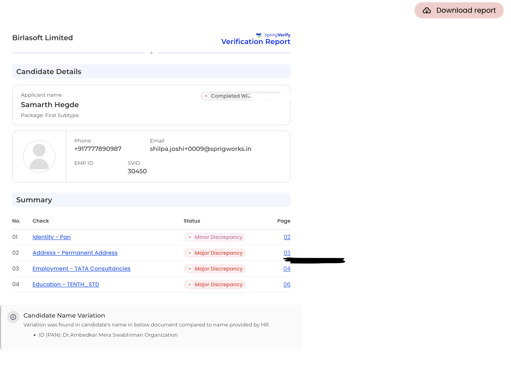 Know how to access, read, and interpret a candidate verification report on SpringVerify. 1. Login to your SpringVerify Account 2. Navigate to Candidates tab 3. Click on the relevant candidate's name 4. The detailed page will open, click View Report ...