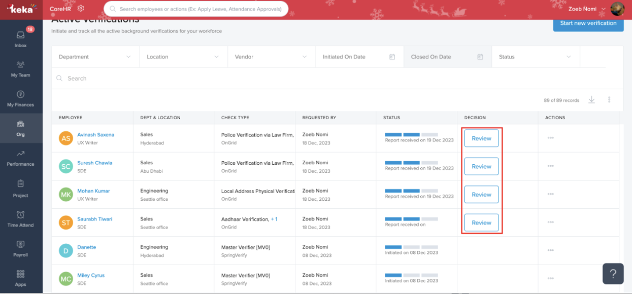 Step 10: After SpringVerify completes the background verification, you can find the report by clicking on the review button next to the employee entry.