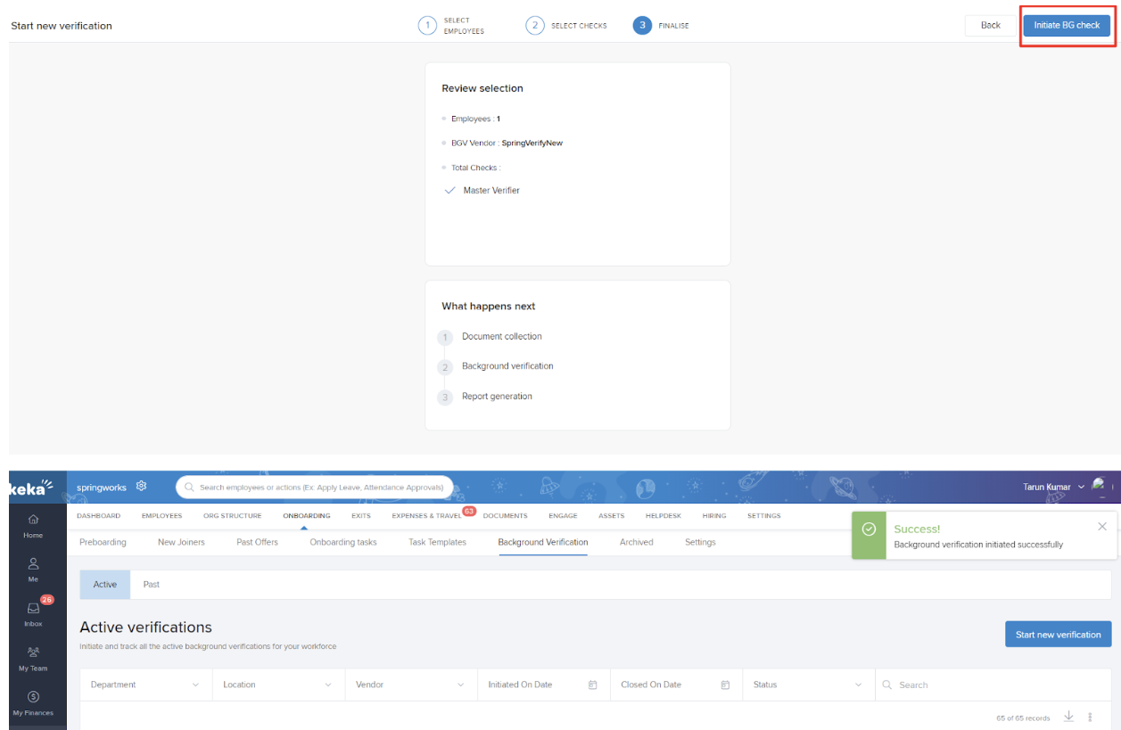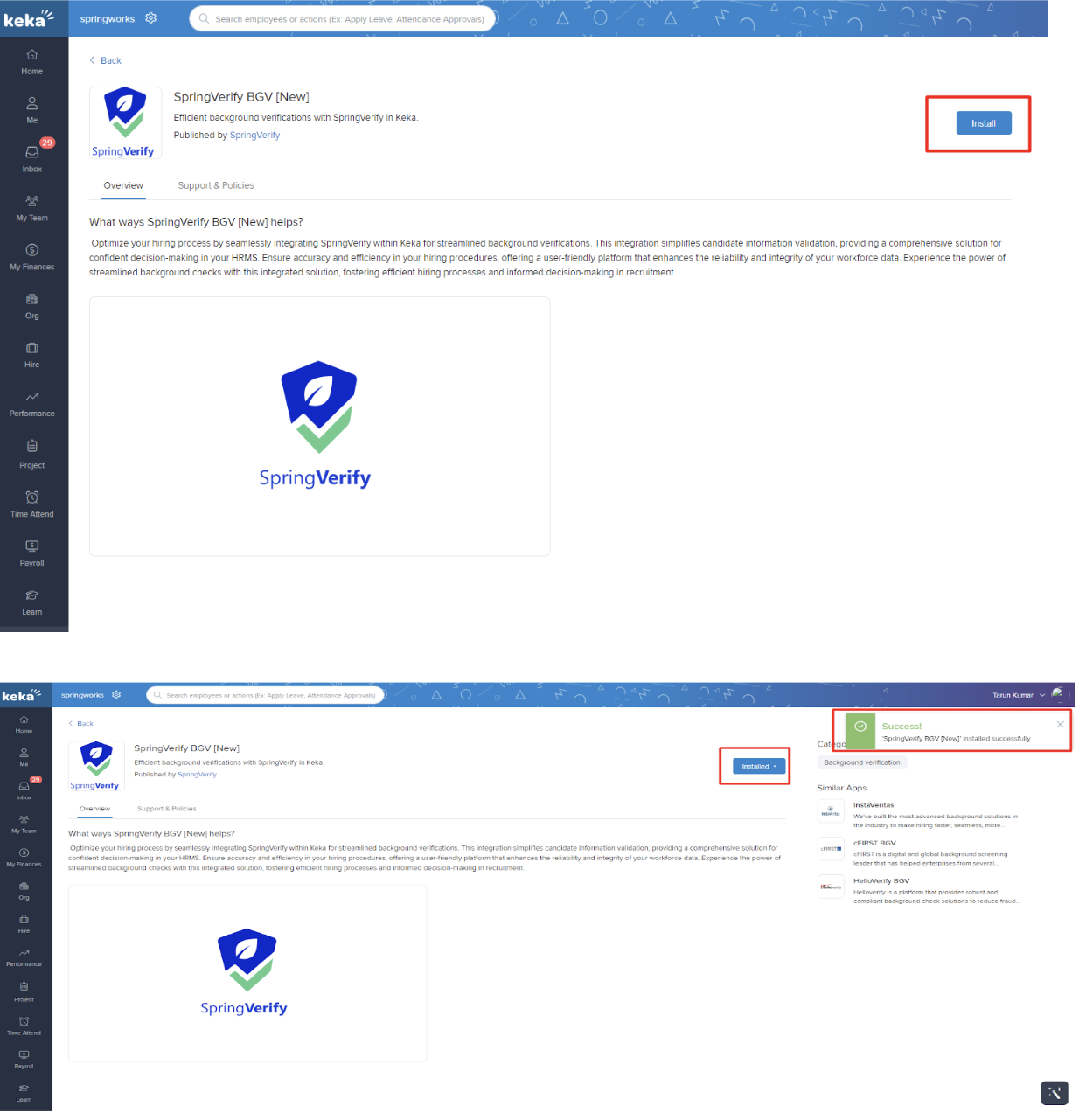 SpringVerify has refined its integration with Keka, providing your organization with an even more streamlined approach to managing employee background verifications. This enhanced integration further optimizes and automates the verification process within the Keka platform.