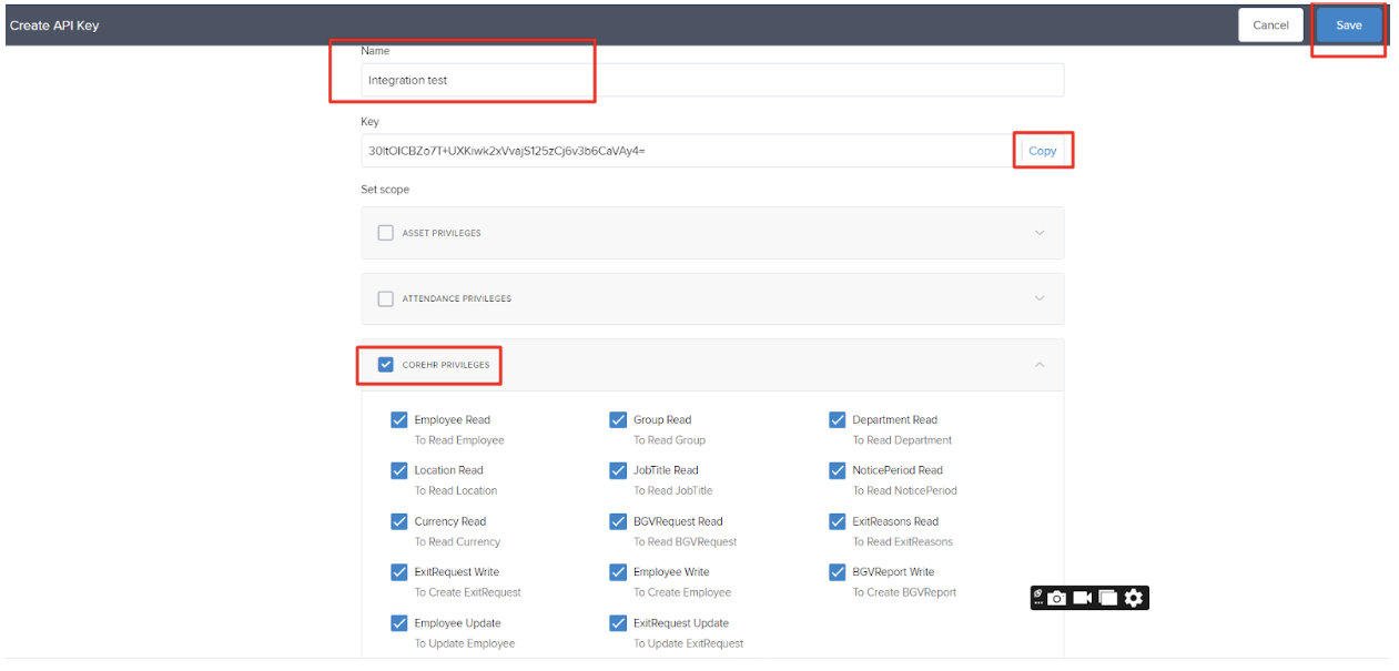 3. Enter the name of the key, select COREHR Privileges, and then click on “Save.”