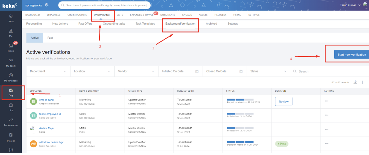 Step 9: Once the background verification is initiated, you can track the status of the BGV from Org > Onboarding > Background Verification.