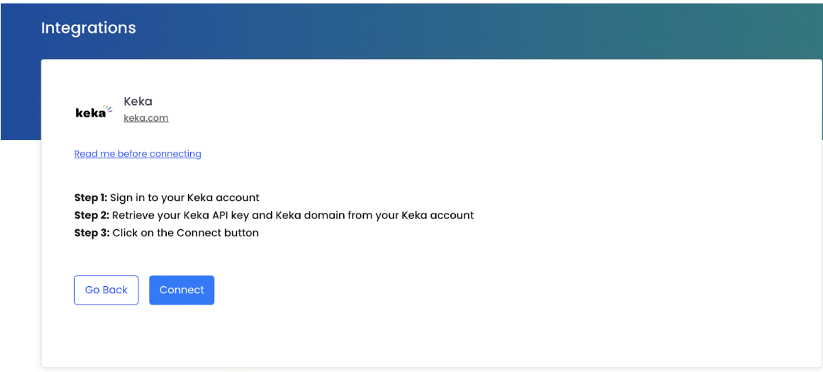 Step 1: Locate the Keka card and click on “Connect” to open it.