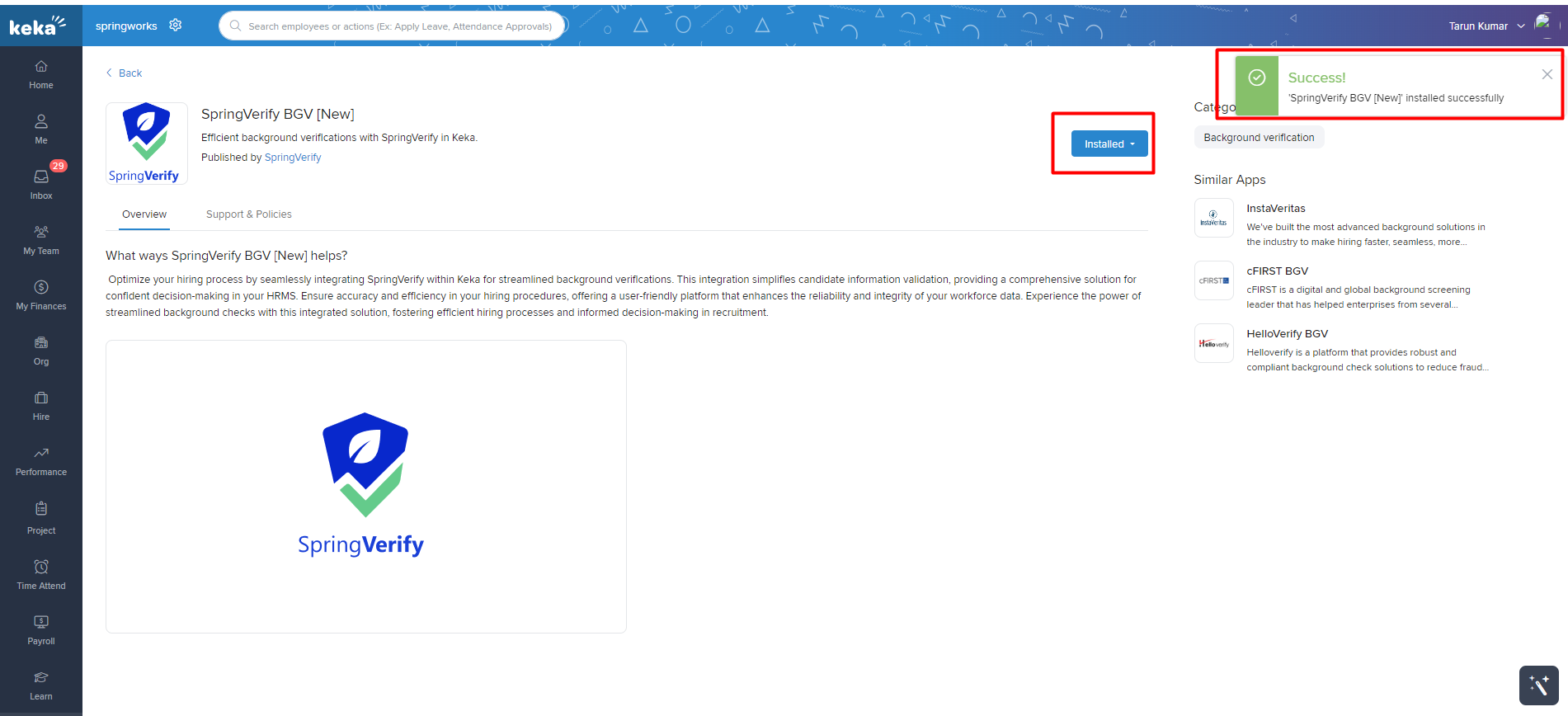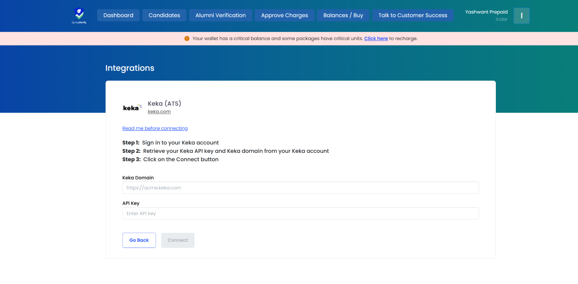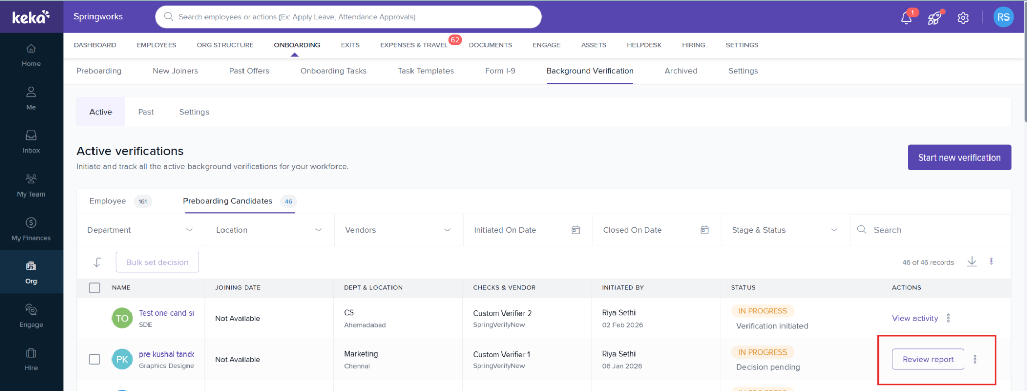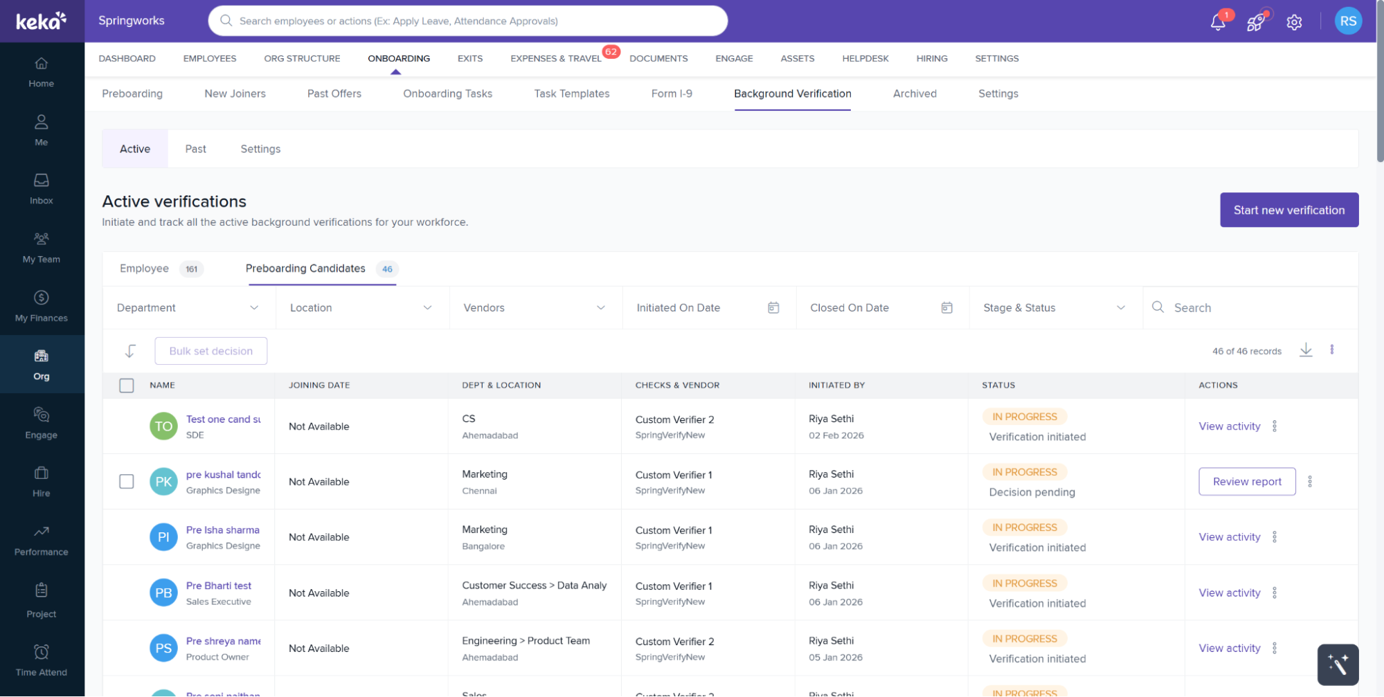 SpringVerify's ATS integration with Keka streamlines background verification for your pre-boarding candidates. When you initiate BGV for candidates in Keka's recruitment module, their details are automatically sent to SpringVerify for verification, and completed reports are delivered back to Keka so hiring managers can review them before onboarding.