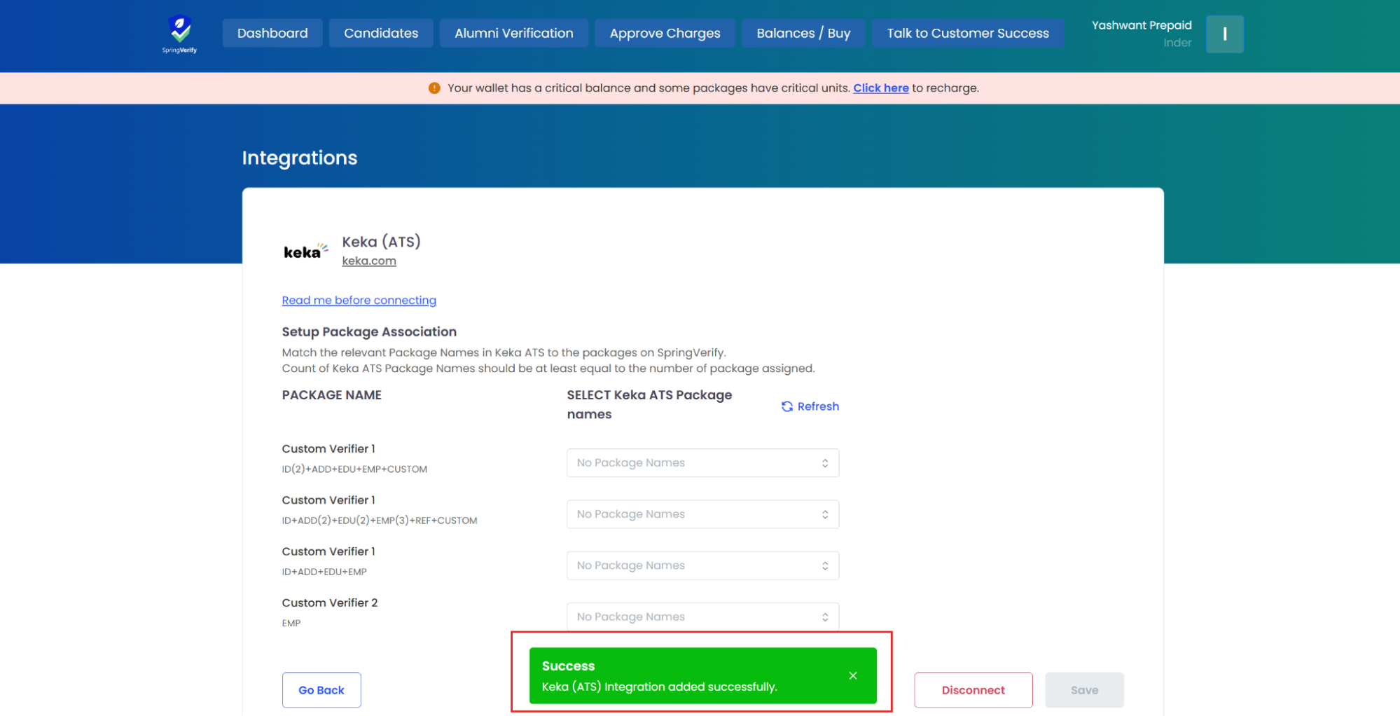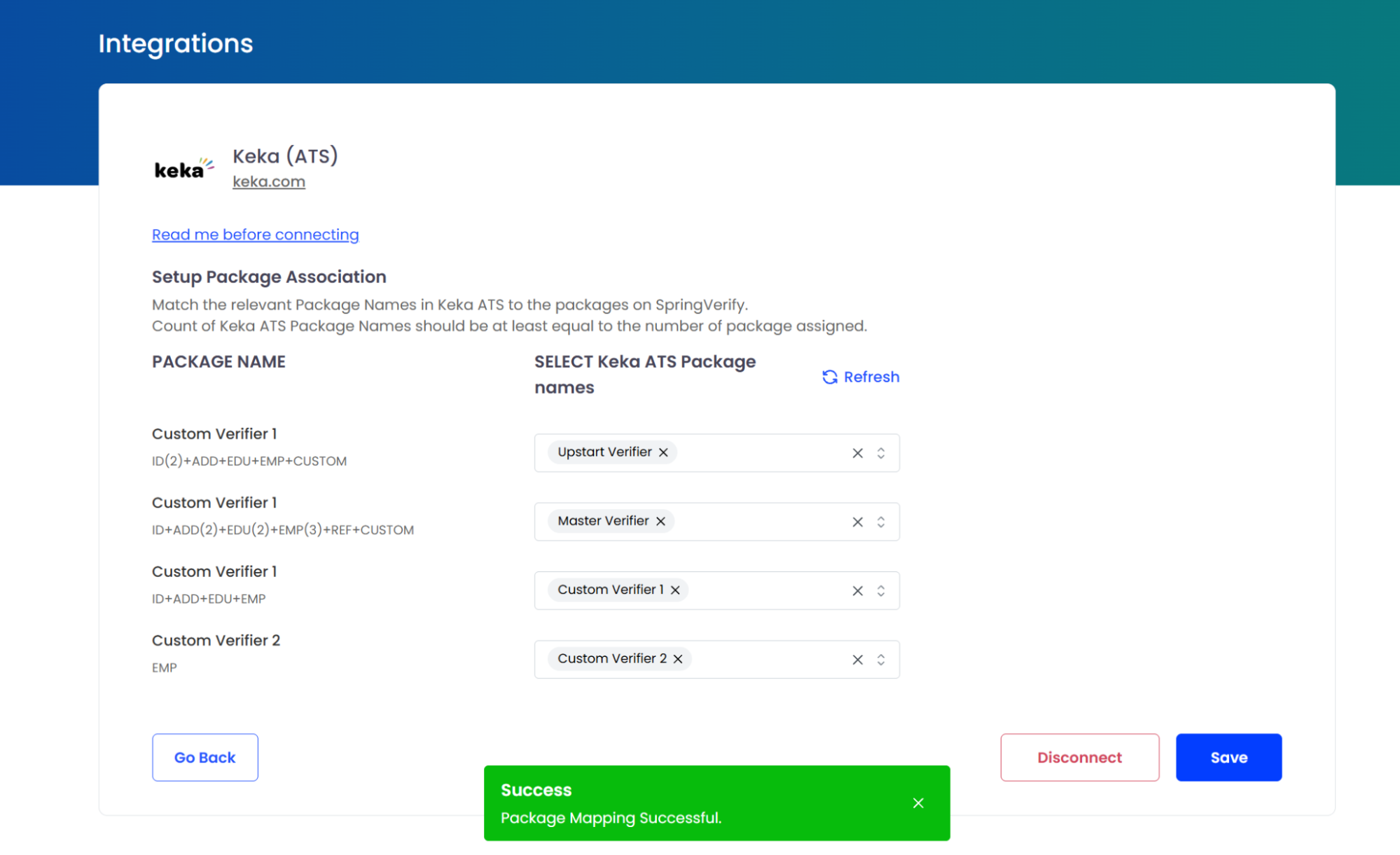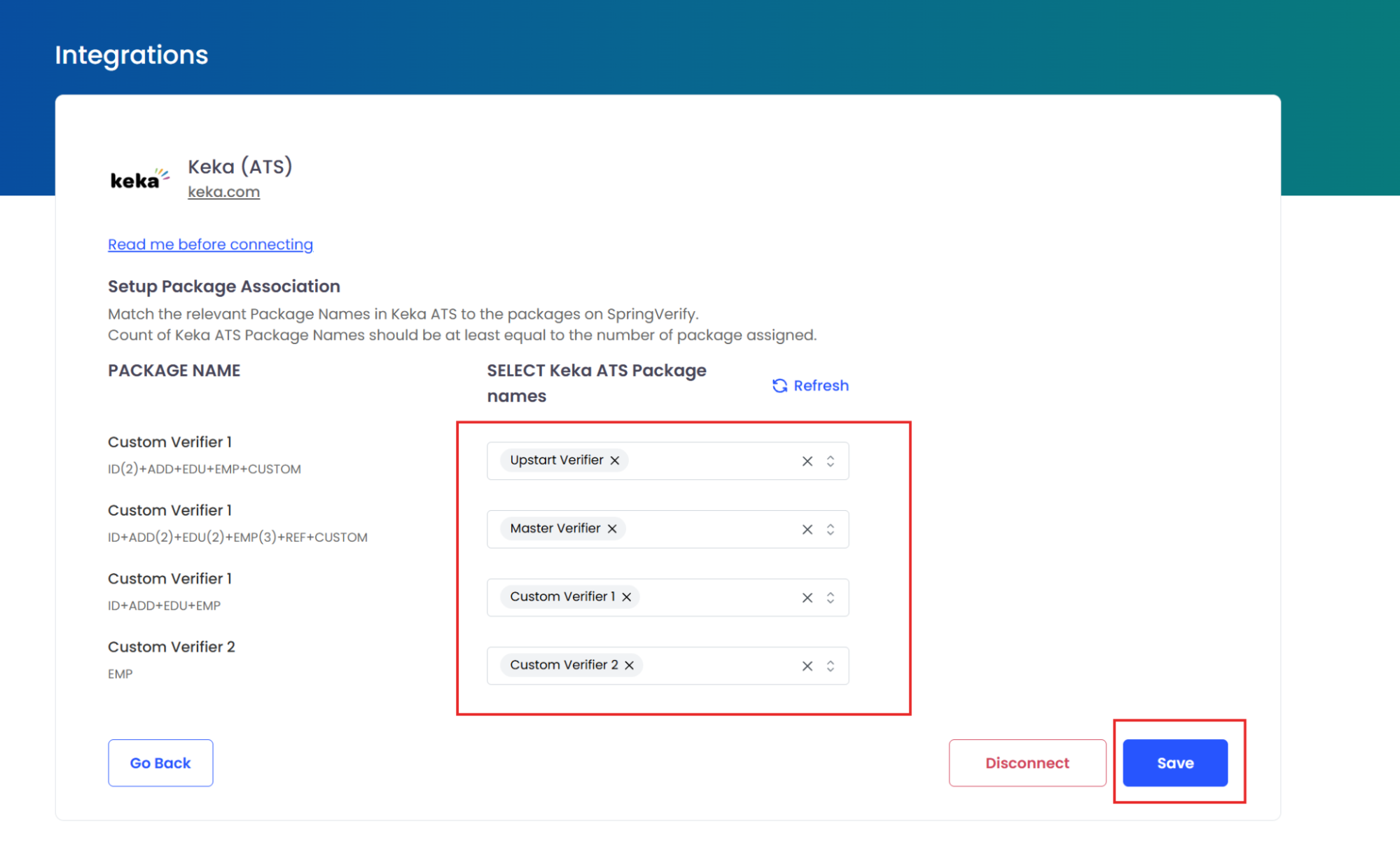 4. Now, select the packages applicable to your organization and click on 'Save' to integrate SpringVerify as your background verification partner