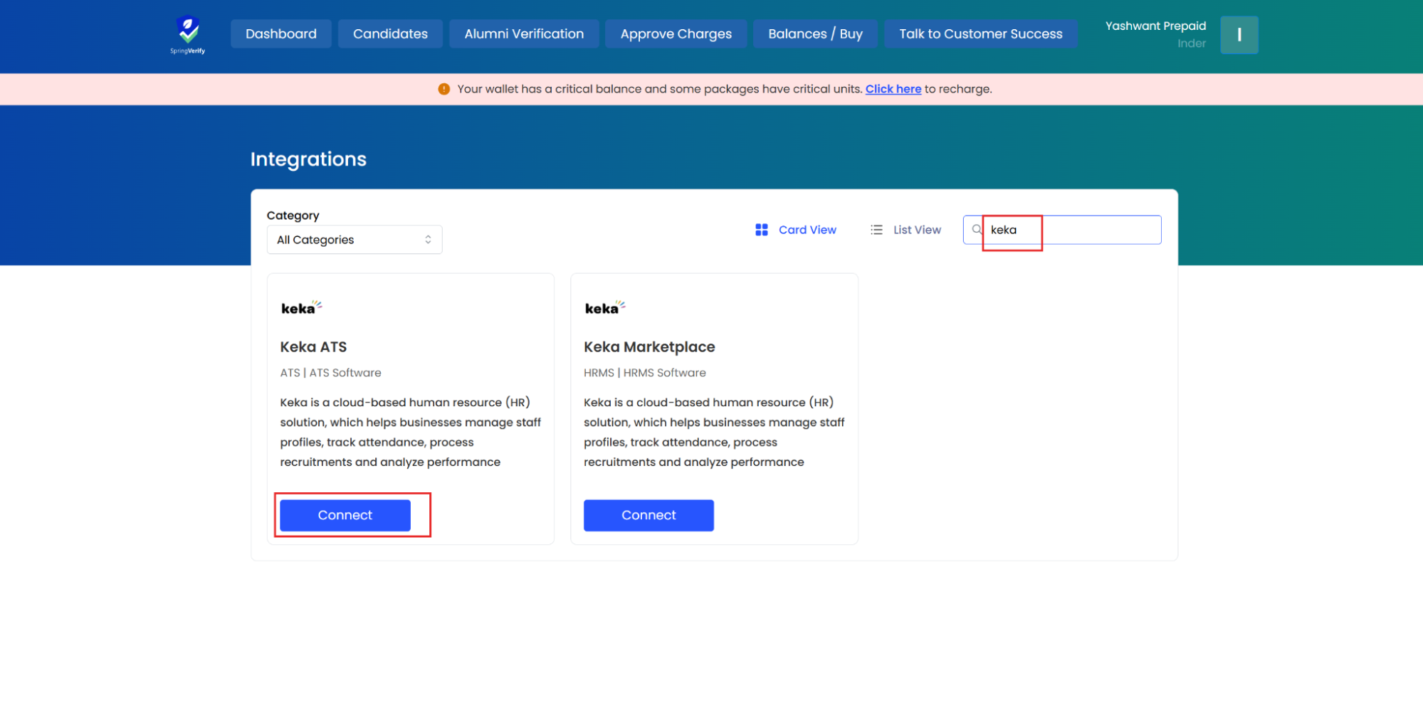 Locate the Keka card and proceed to open it by clicking “Connect”.