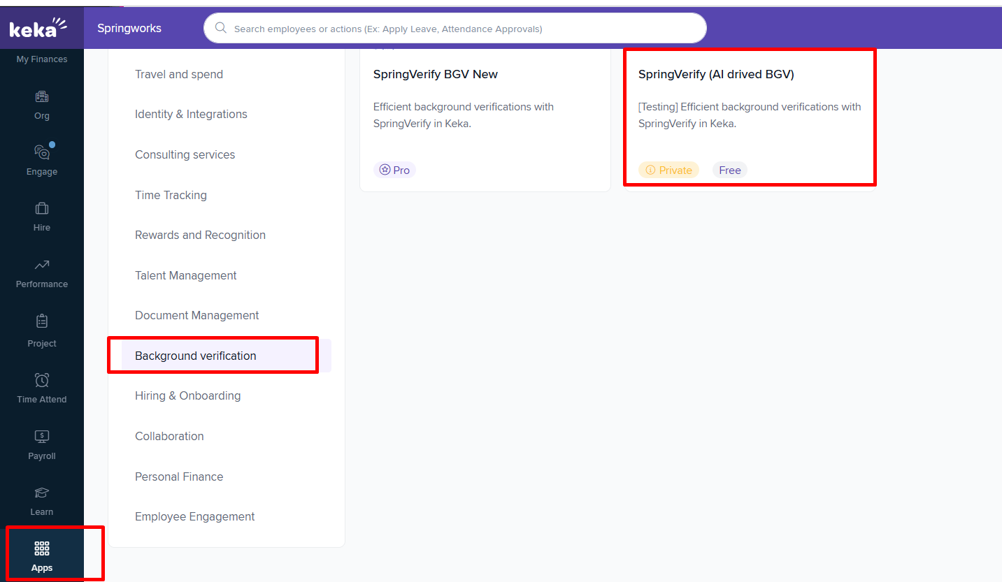 Step 1: Navigate to Apps ➡️ Background Verification ➡️ SpringVerify (AI drived BGV).