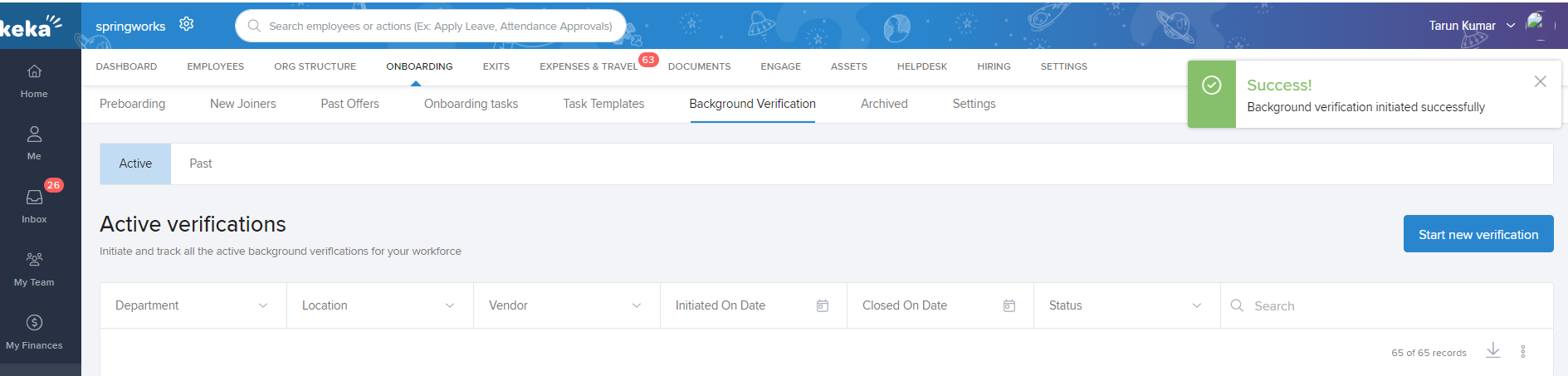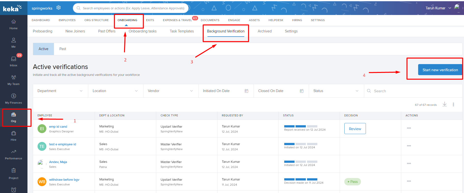 Step 9: Once the background verification is initiated, you can track the status by navigating to Org ➡️ Onboarding ➡️ Background Verification.