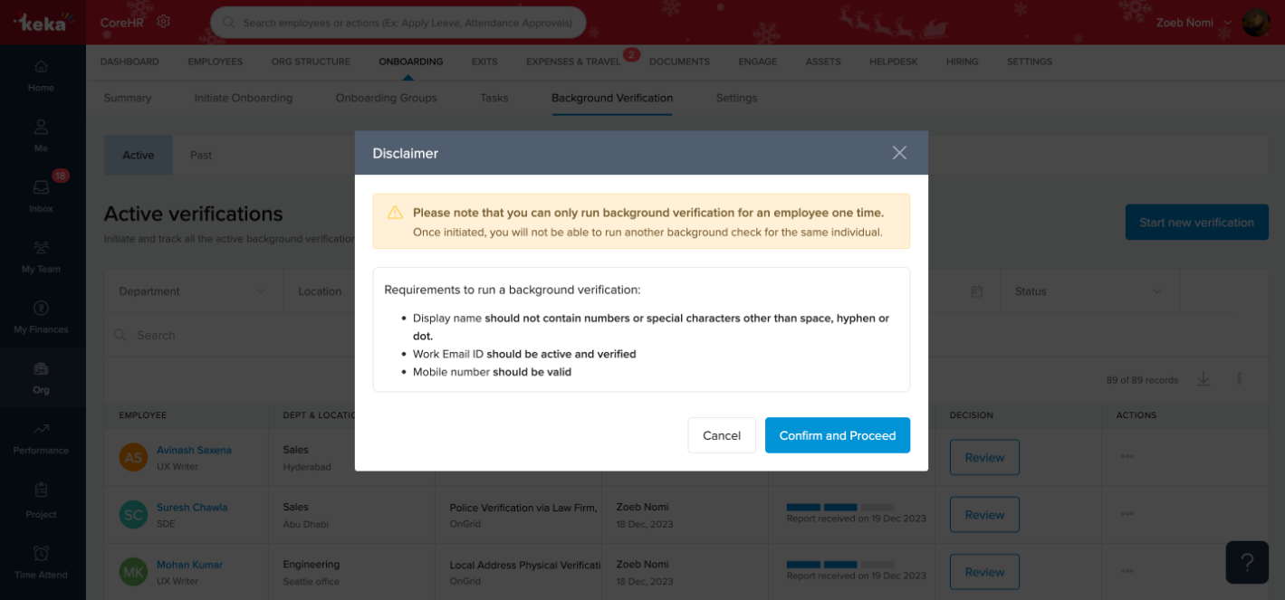 Step 5: In the disclaimer pop-up, click on Confirm and Proceed. You will then need to select the employees for whom you wish to initiate the background verification (BGV) process.