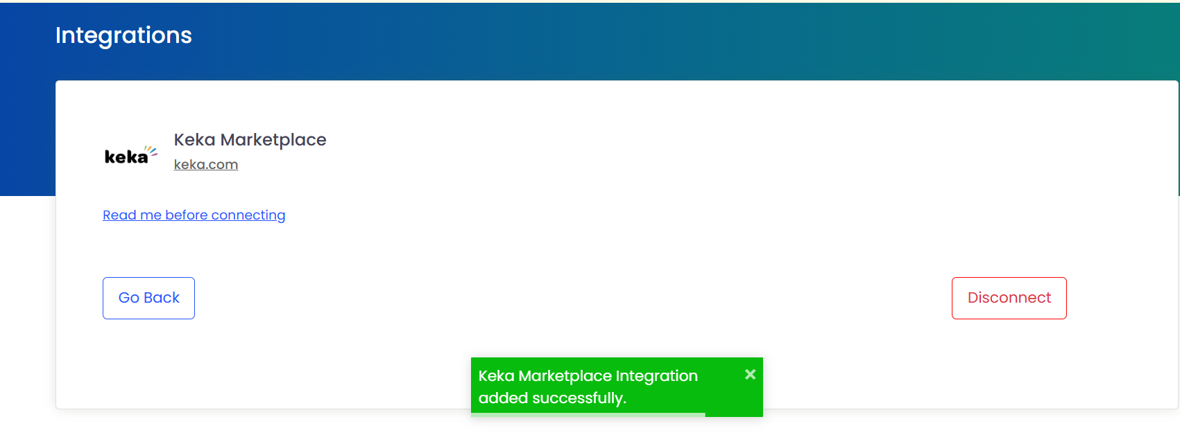 2. In the Keka Marketplace integration card, click the ‘Connect’ button. If already logged into Keka, a success message will appear; otherwise, you will be redirected to the Keka login page.