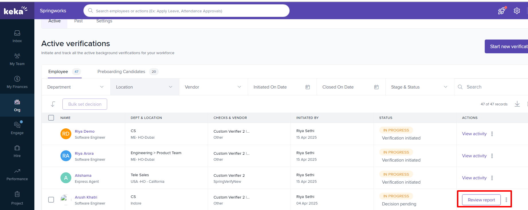 The employee will be added to SpringVerify immediately after initiation from Keka.