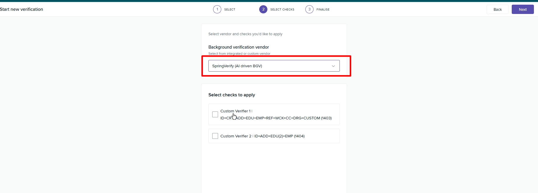 Step 7: From the drop-down menu, select the vendor SpringVerify (AI drived BGV)
