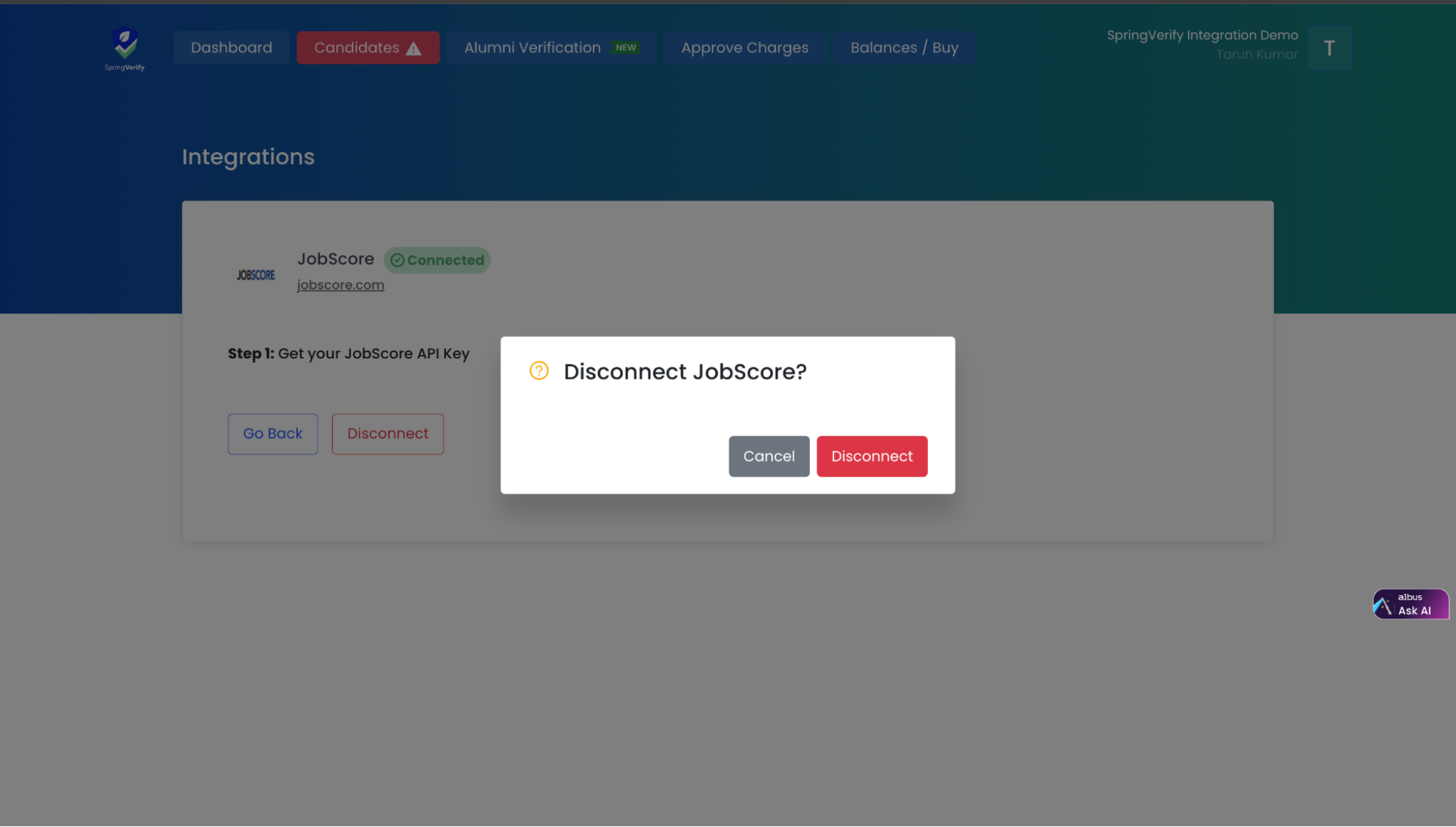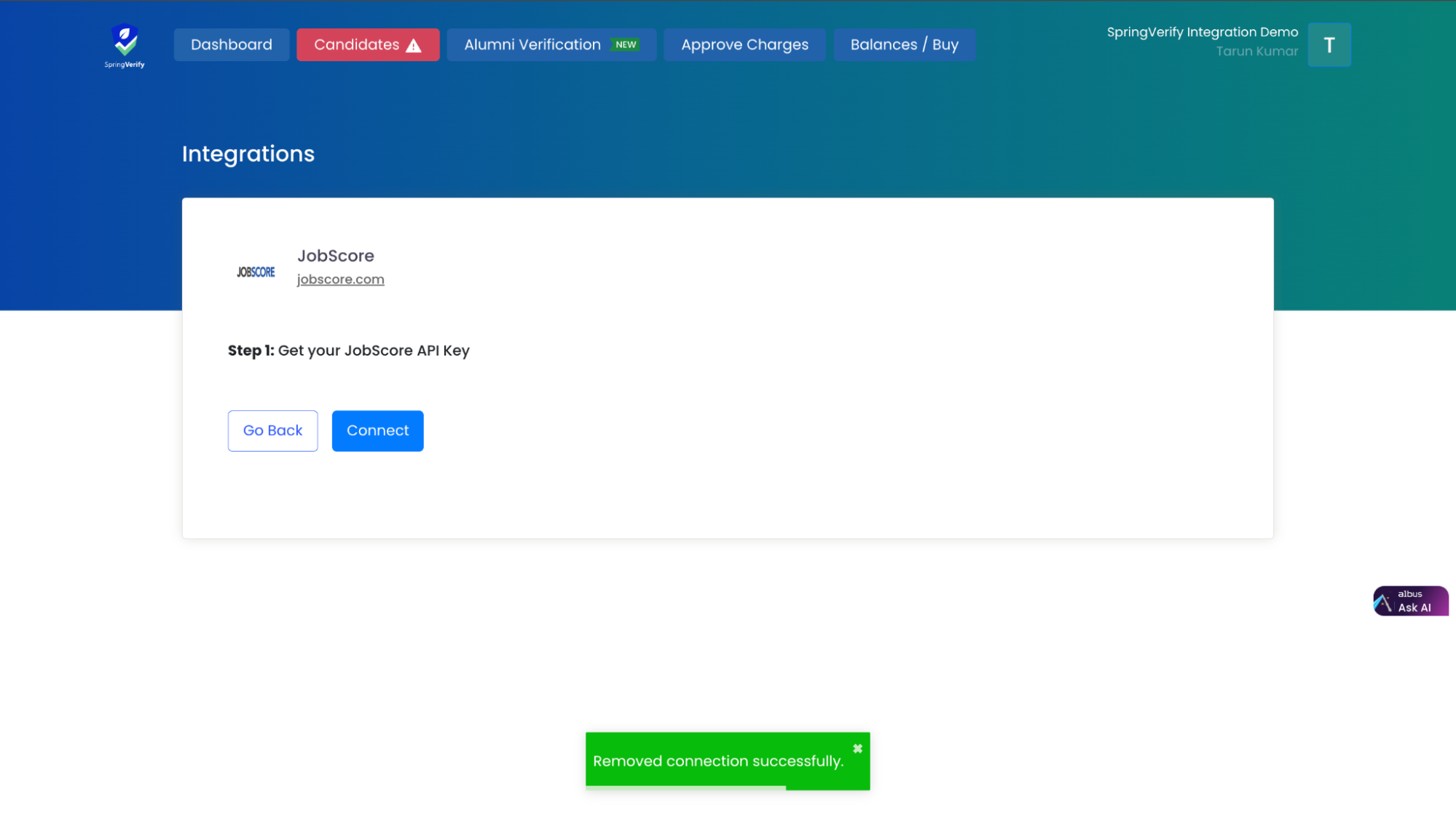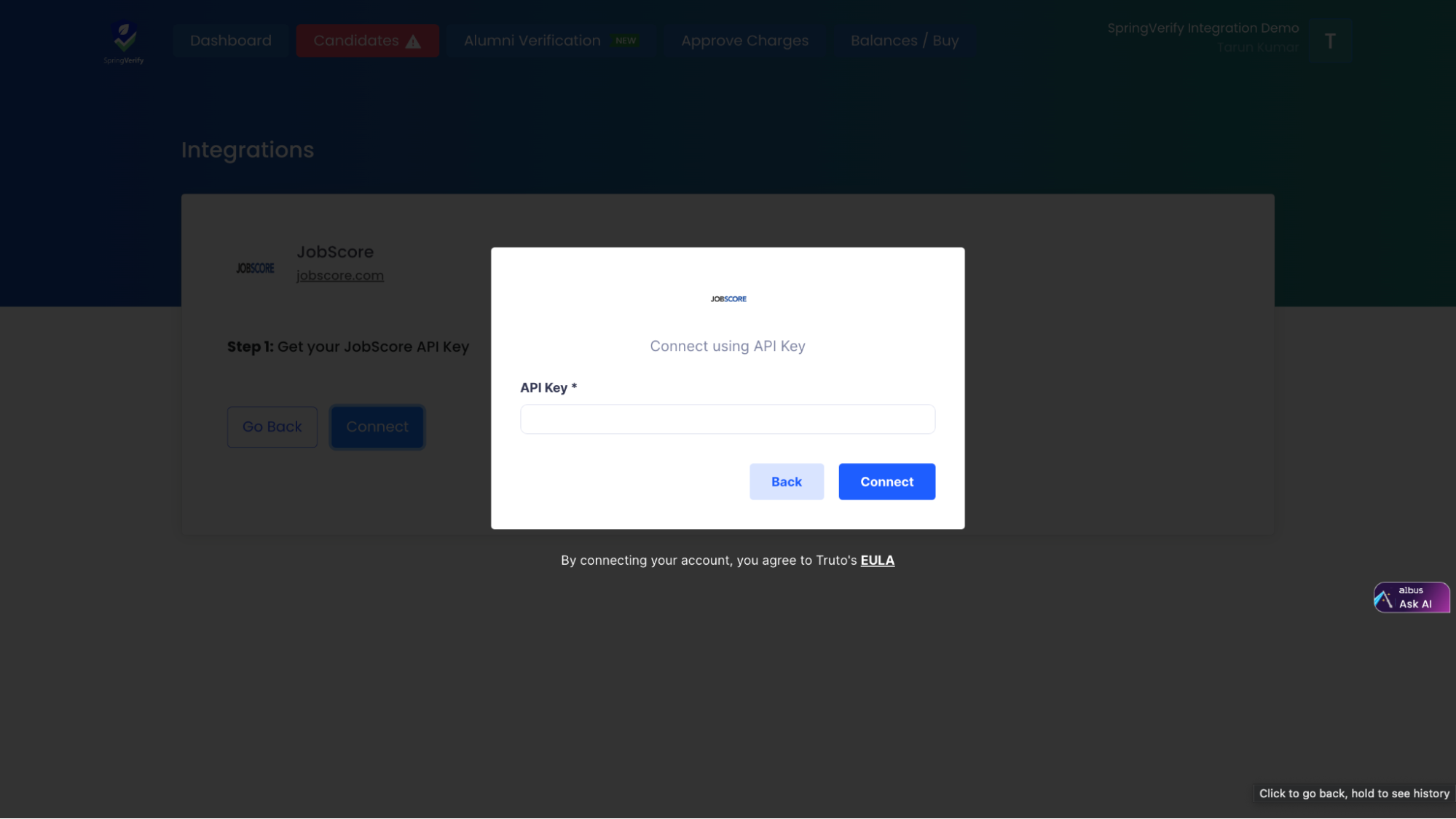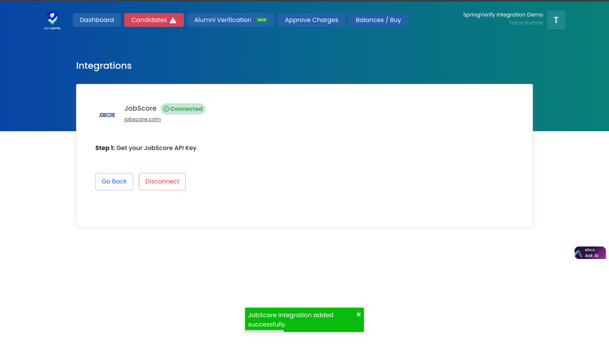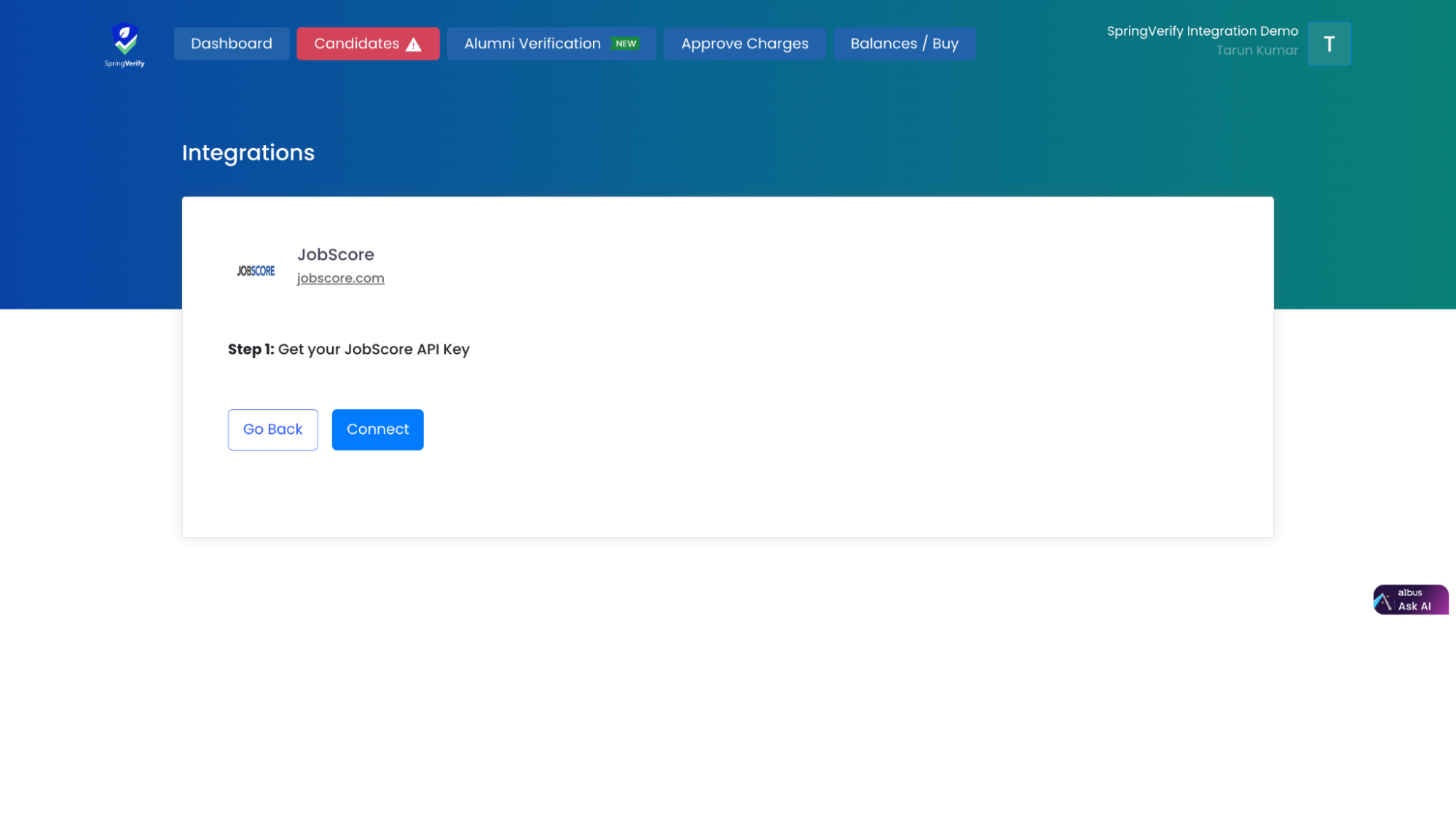 SpringVerify IN has developed integrations with JobScore, allowing clients to use the API Key from the JobScore platform. This integration streamlines and automates background verification processes within the JobScore environment.