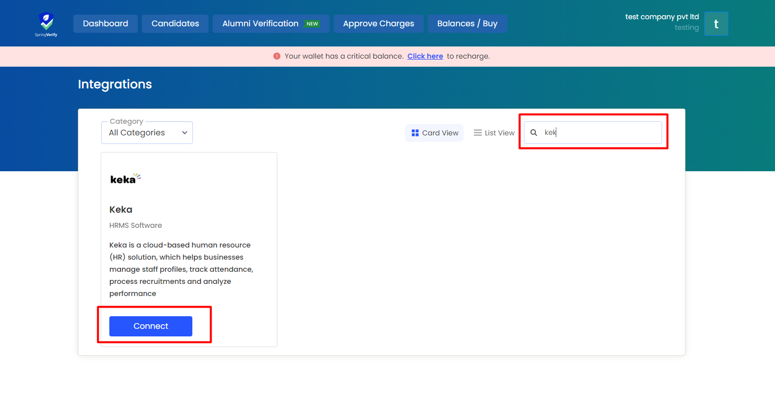1. Locate the Keka card and proceed to open it by clicking “Connect”
