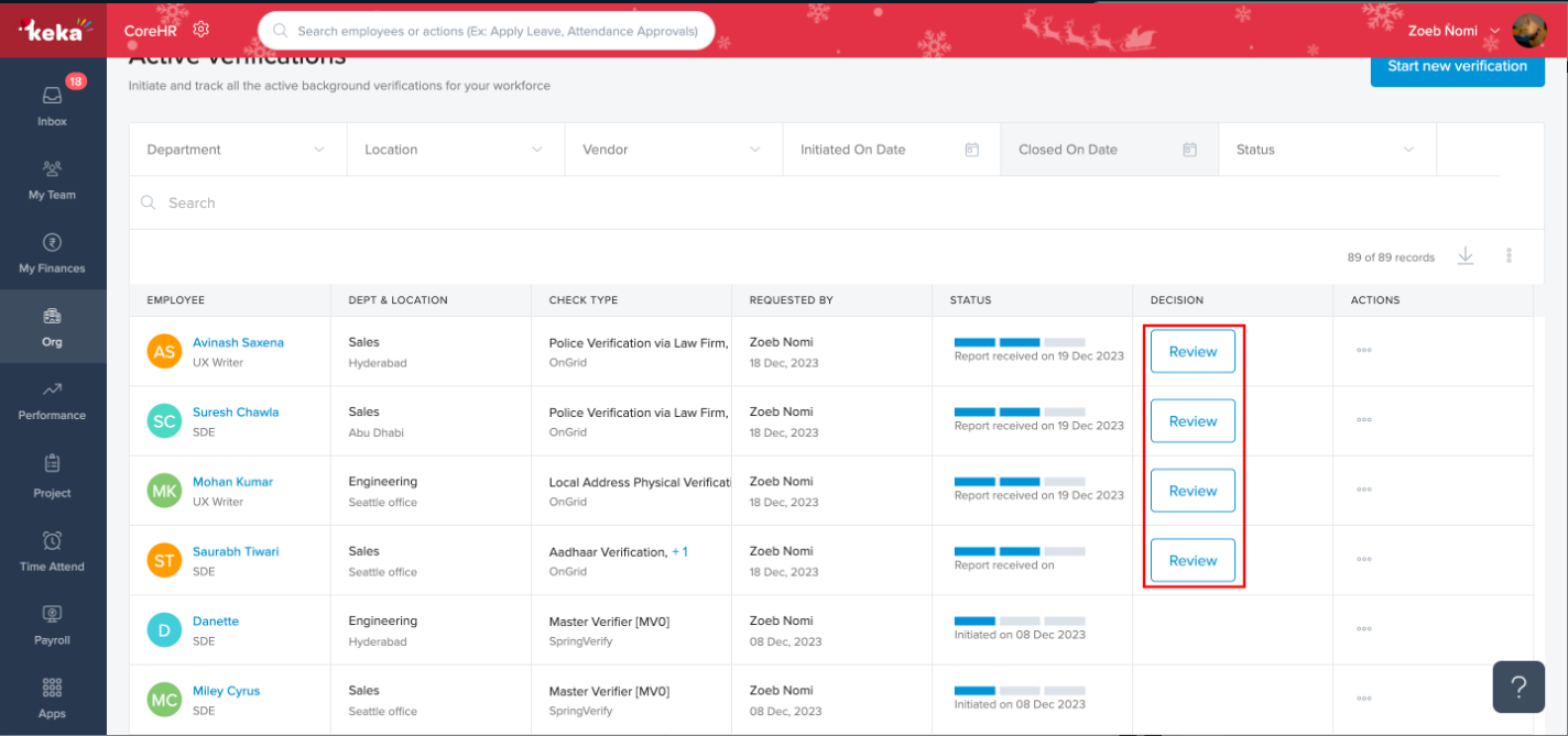 Step 9: Once the background verification is initiated, you can track the status of the BGV from Org > Onboarding > Background Verification.