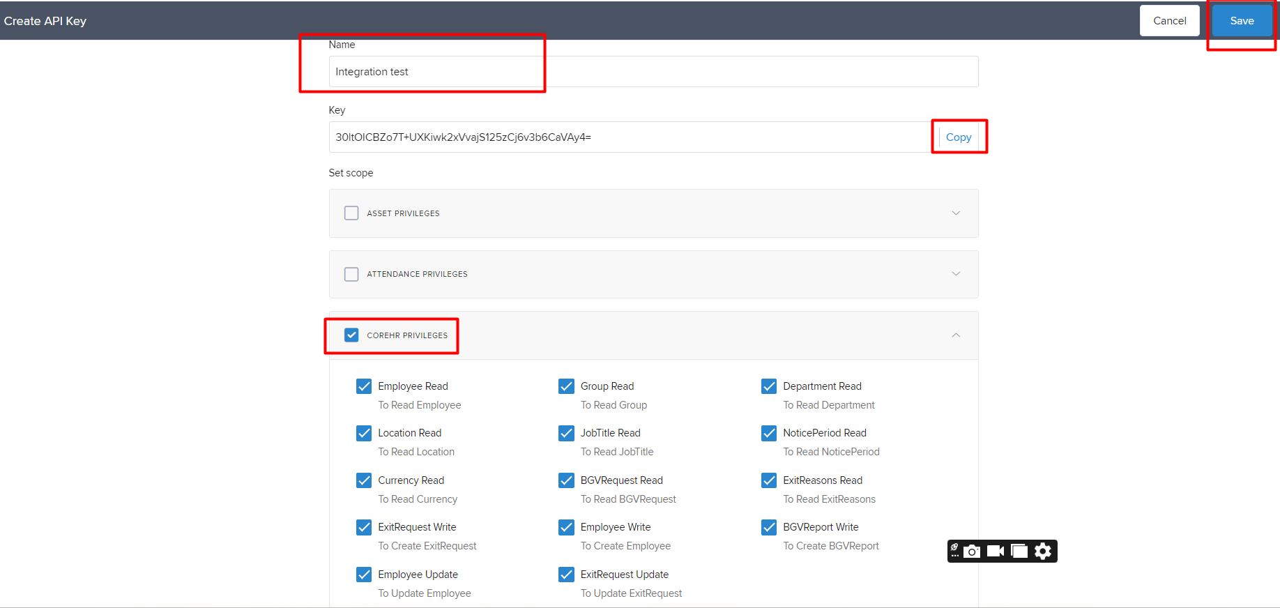 3. Enter the name of the key, select COREHR Privileges, and then click on “Save”.