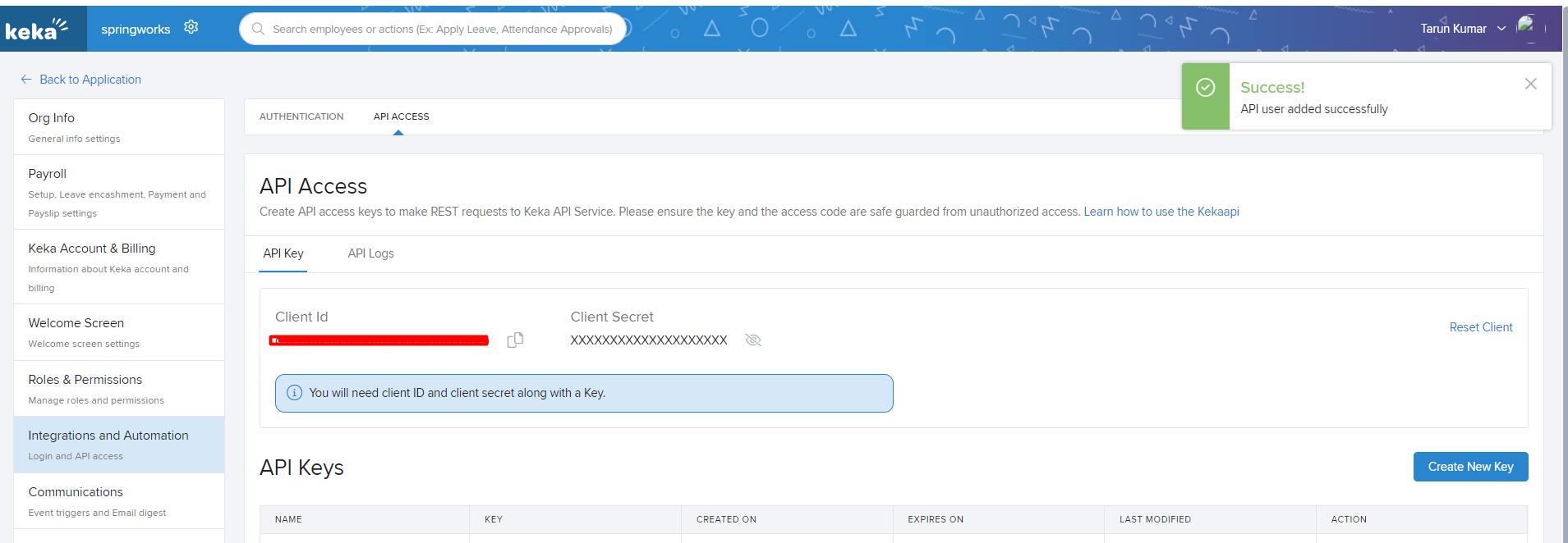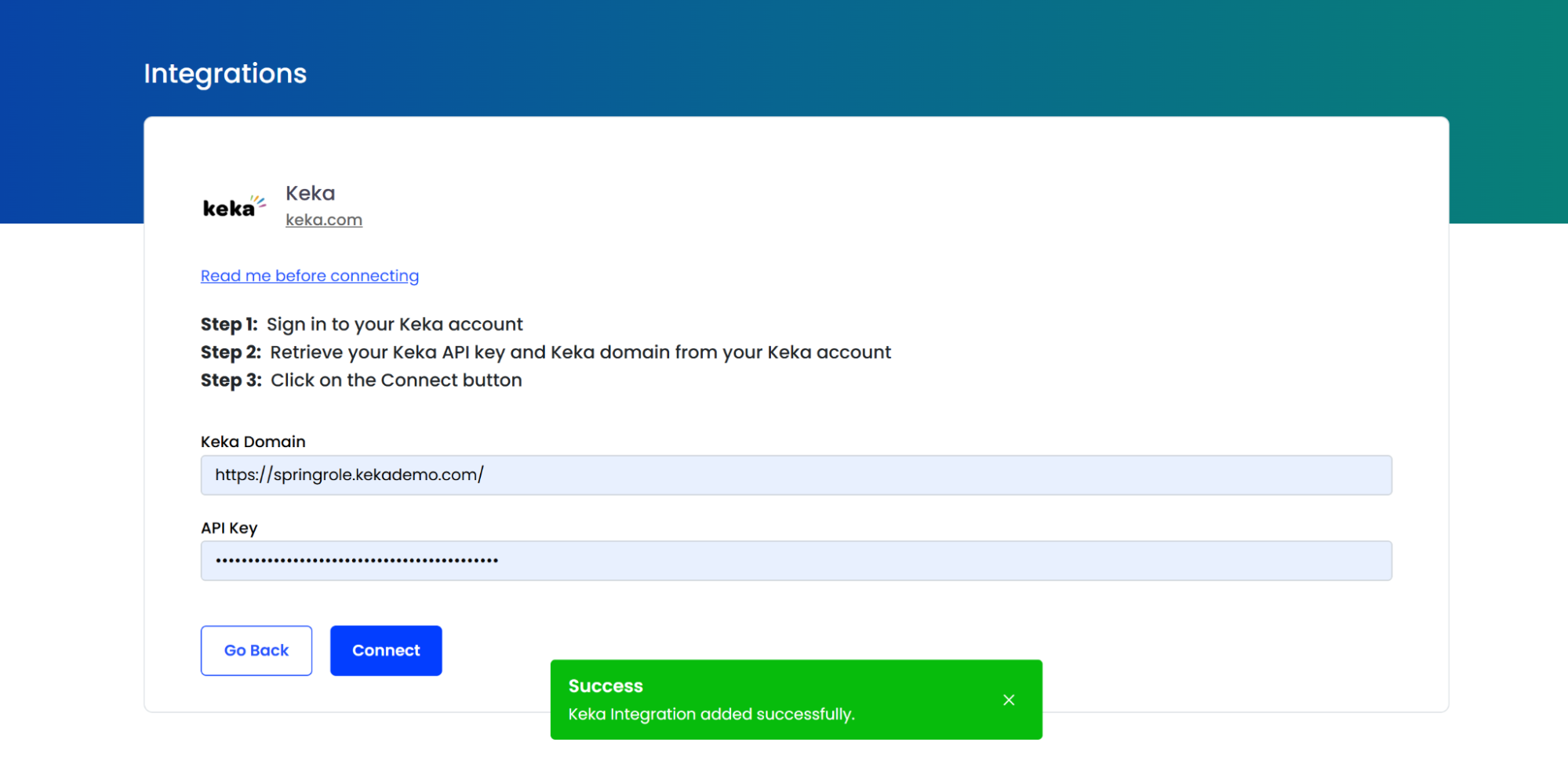 3. You will receive a successful toast message “Keka Integration added successfully”