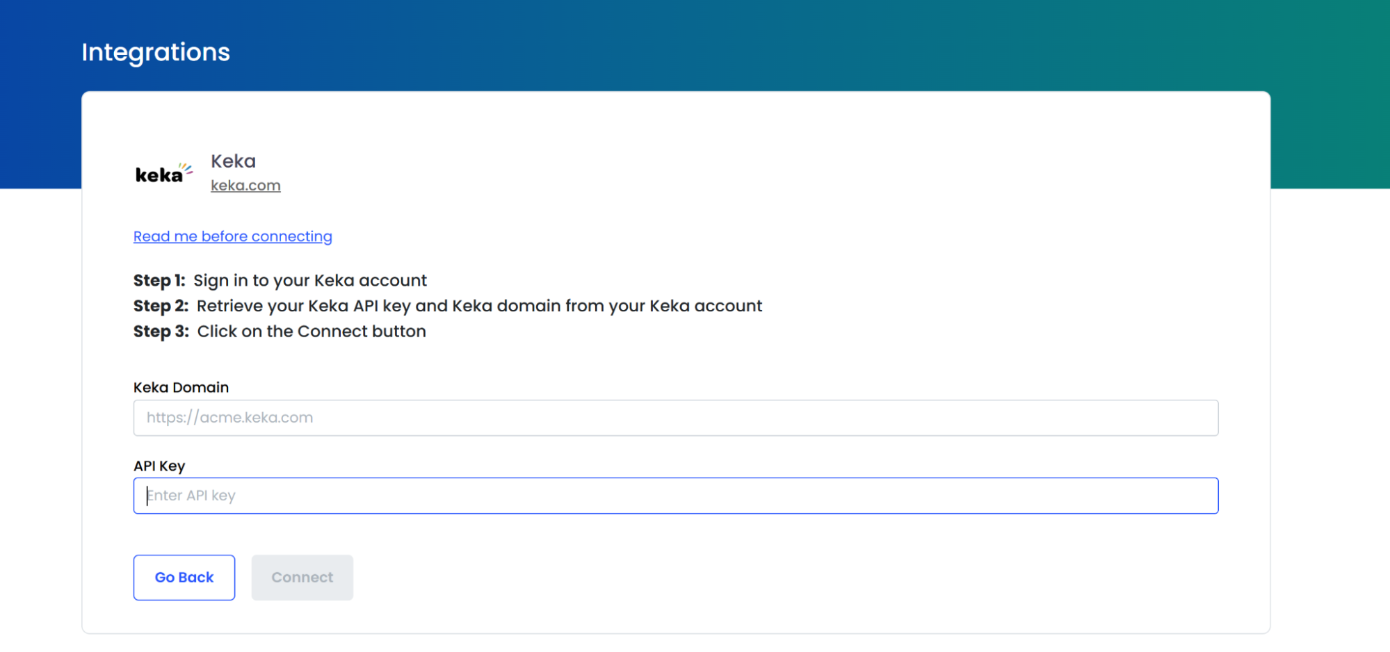 2. Enter your Keka subdomain, API Key, then Click on “Connect”