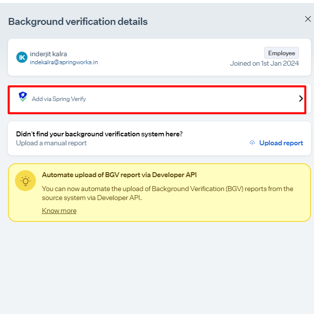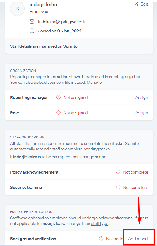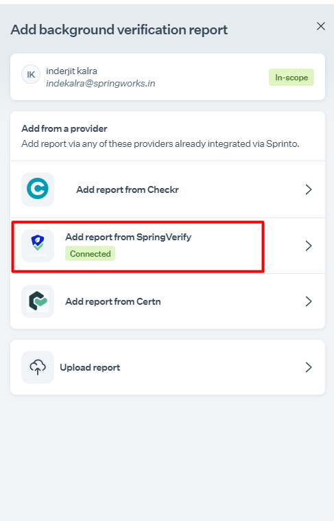 Once the candidate has completed the BGV (Background Verification) and the verification is done, you can sync the candidate's report to Sprinto.