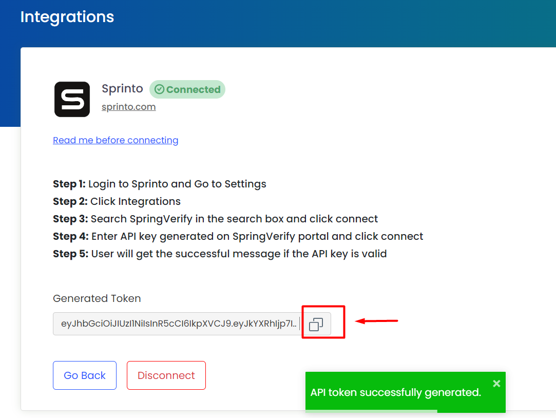e. Save the API token securely as it will be used to connect your SpringVerify account with Sprinto.