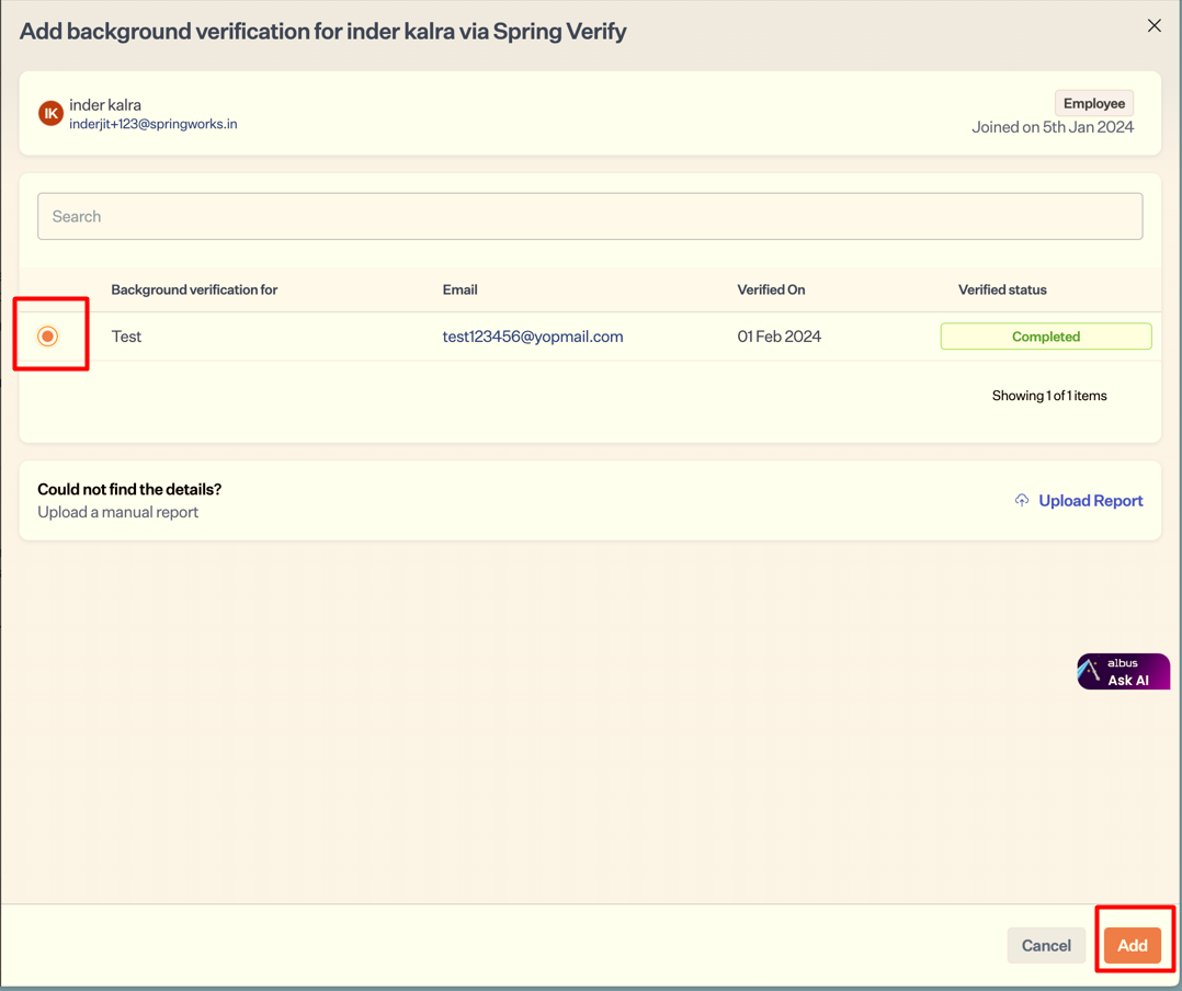 Navigate to the background verification option on the candidate's page and click 'Add Report'.