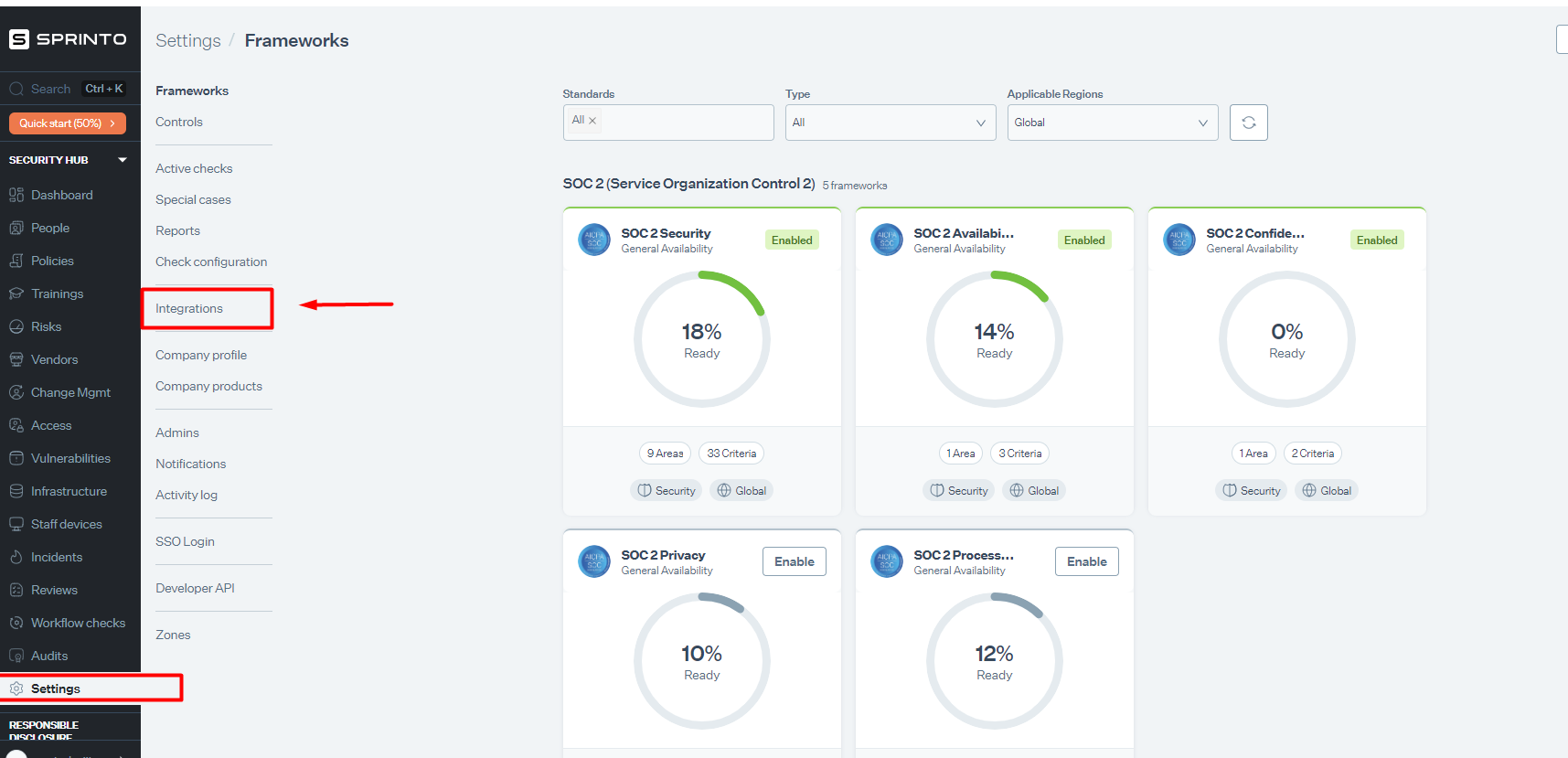 Log in to Sprinto and navigate to ‘Settings’ from the menu on the left-hand side.
