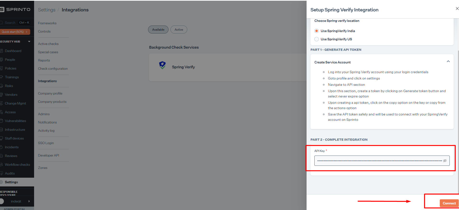 4. Enter the API key generated on the SpringVerify portal and click on connect.