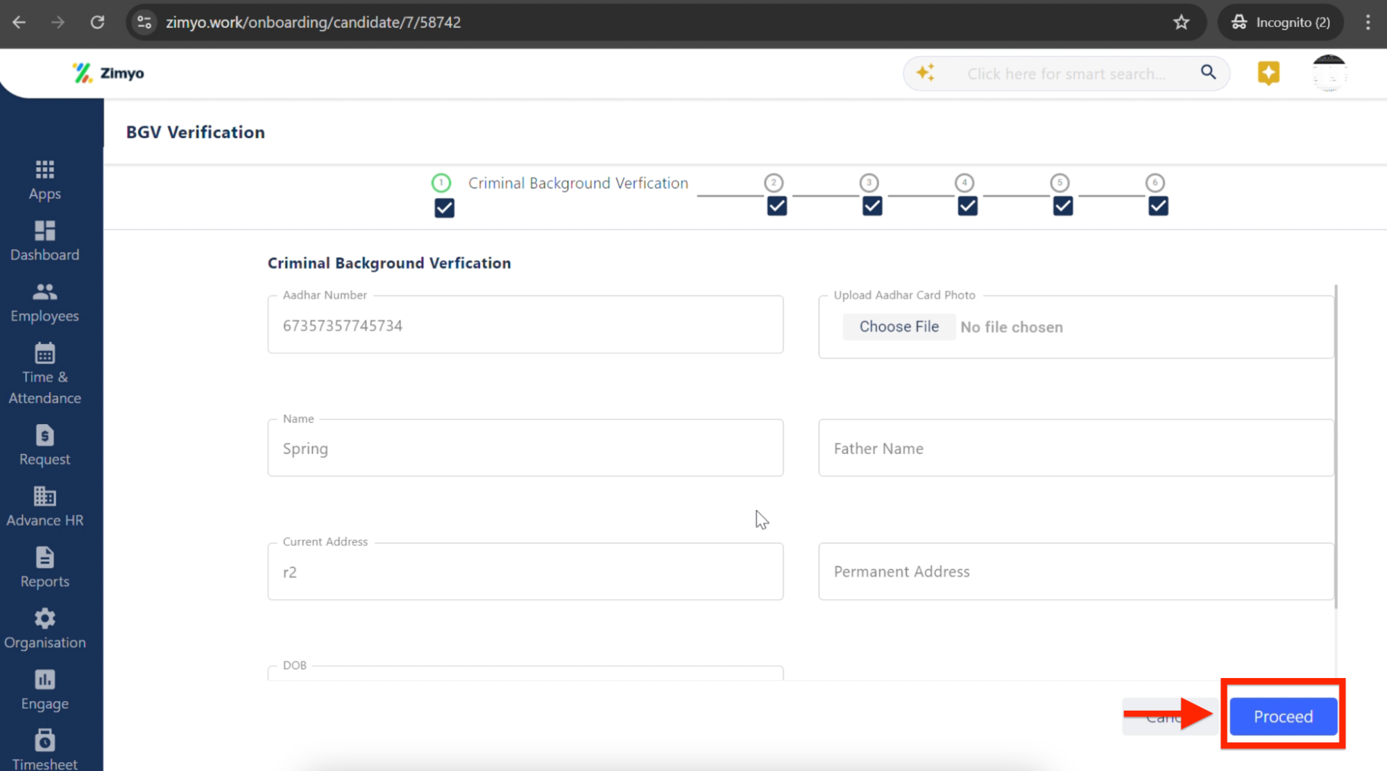 2. This will open the Candidate Background Verification page, displaying the details provided by the candidate. Review the information and click Proceed to view the next set of details.