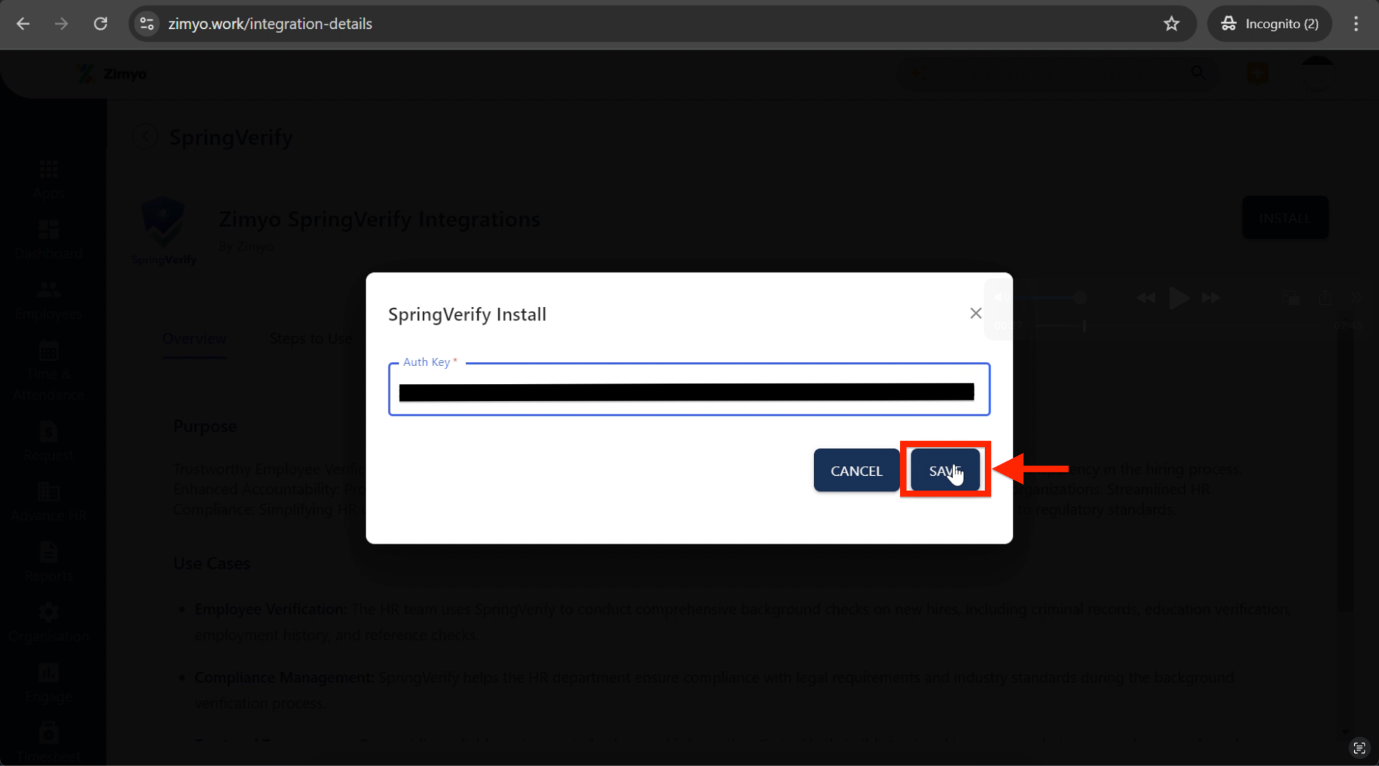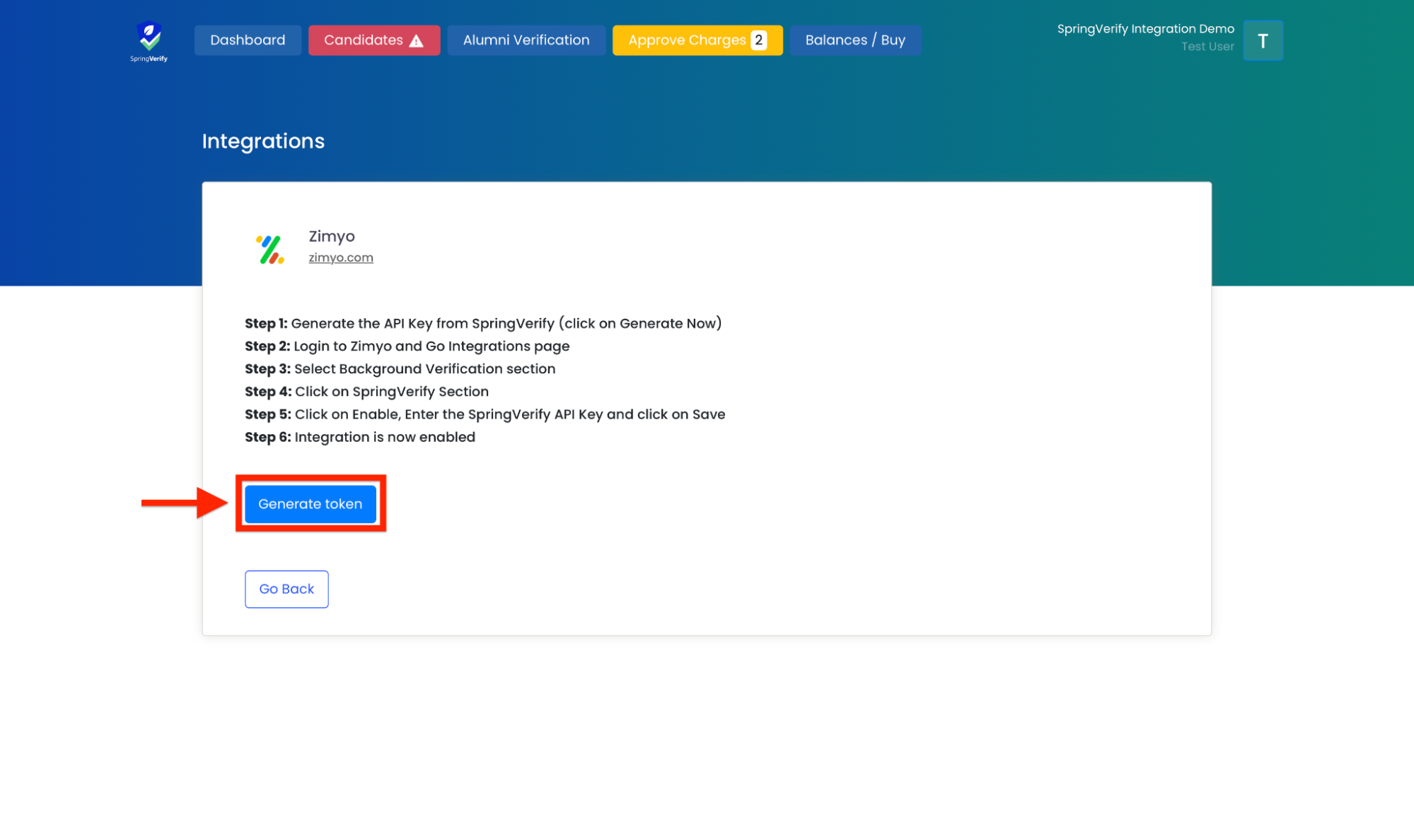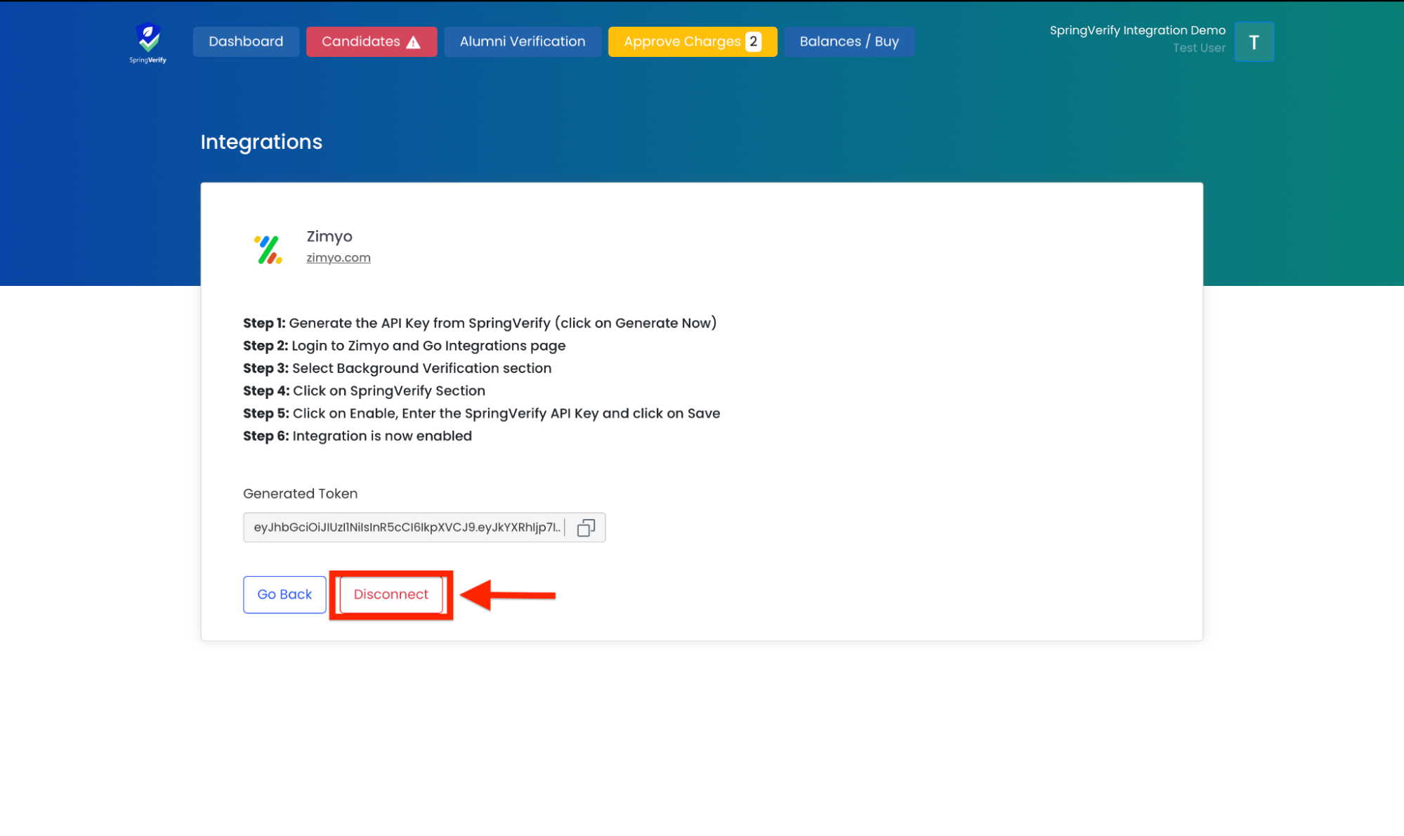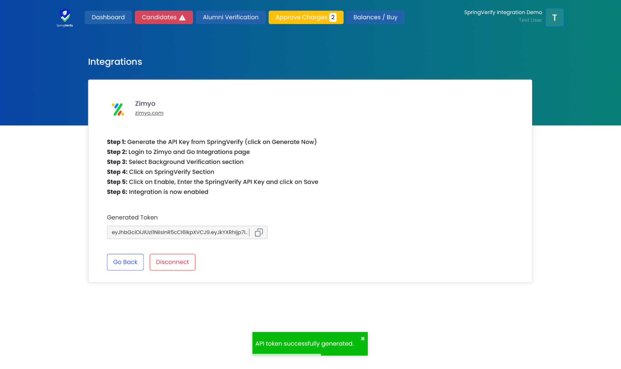 4. Use the generated SpringVerify token to enable the Integration on the Zimyo platform