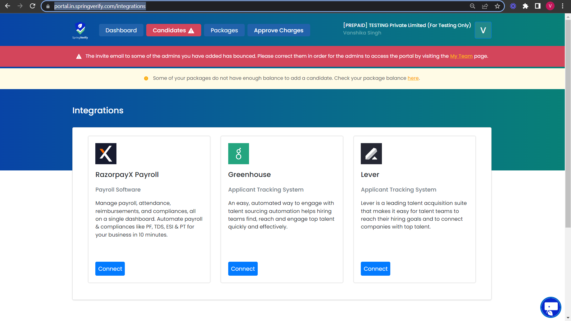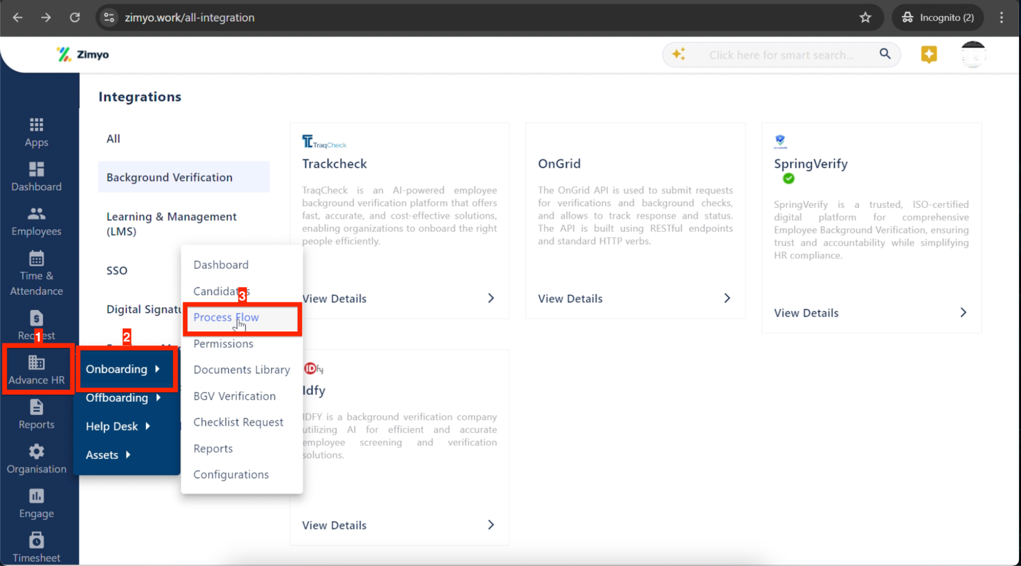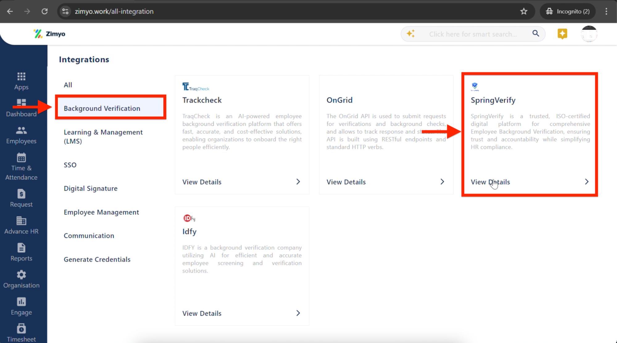 SpringVerify IN integrates seamlessly with Zimyo, enabling clients to automate background verification (BGV) directly from the Zimyo platform.