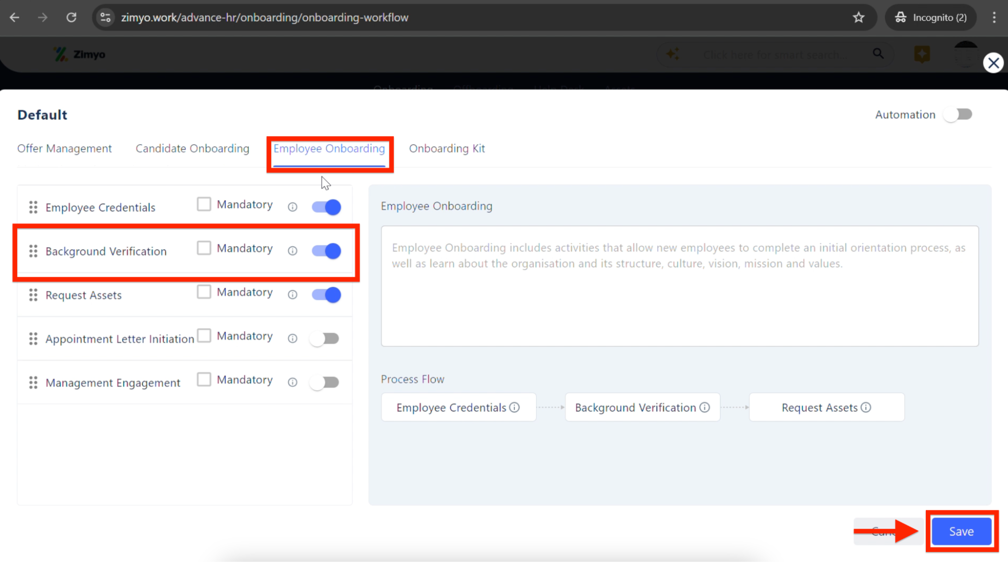 3. In the Default Workflow, open the Employee Onboarding section, ensure the Background Verification is enabled as true, and click on Save