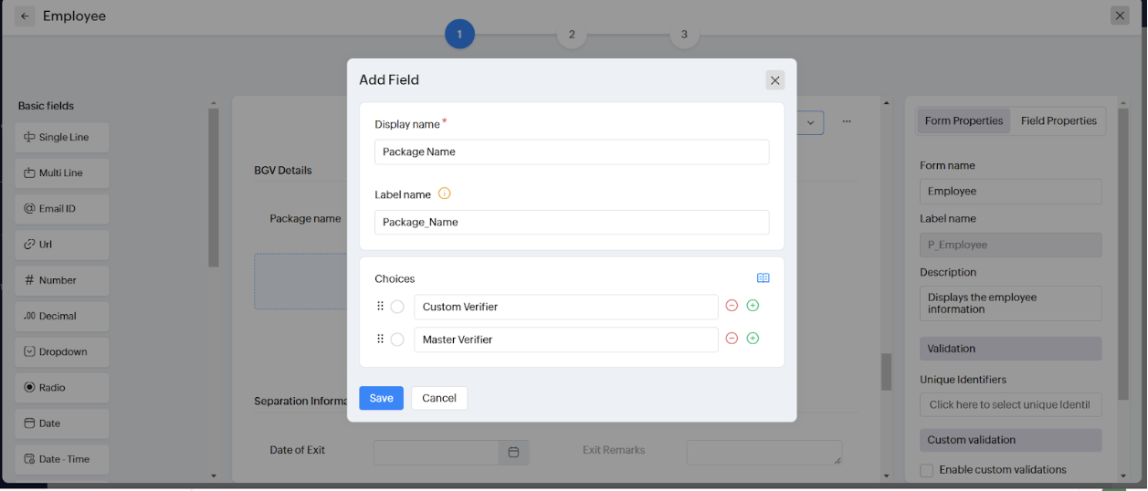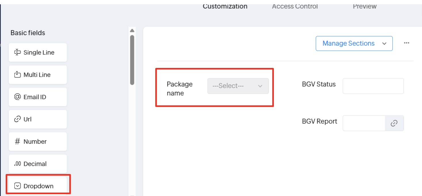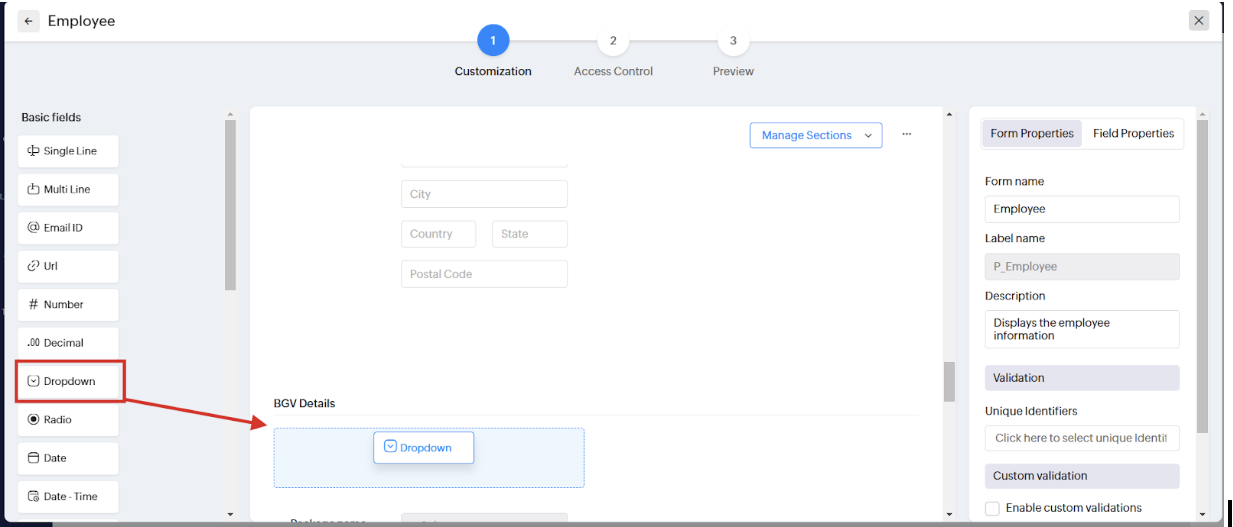 4. Drag and drop the Dropdown field into the BGV Details section, as shown in the image above.
