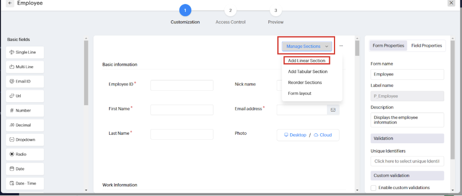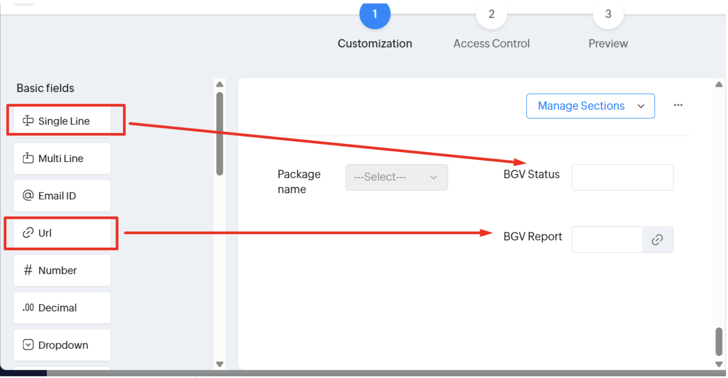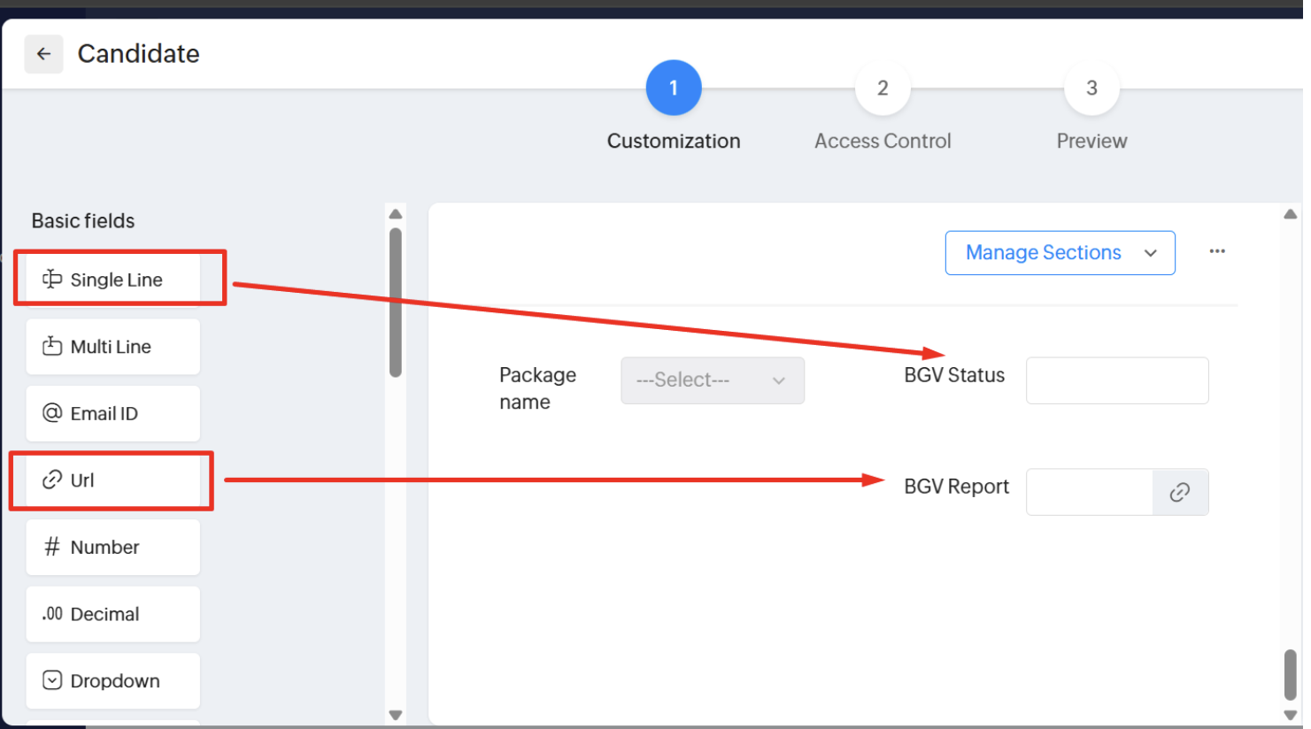 3. Add a new section by clicking on "Manage Sections", then select "Add Linear Section" and name it "BGV Details".