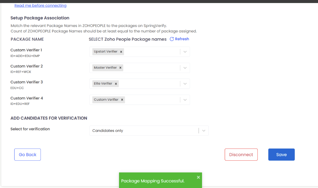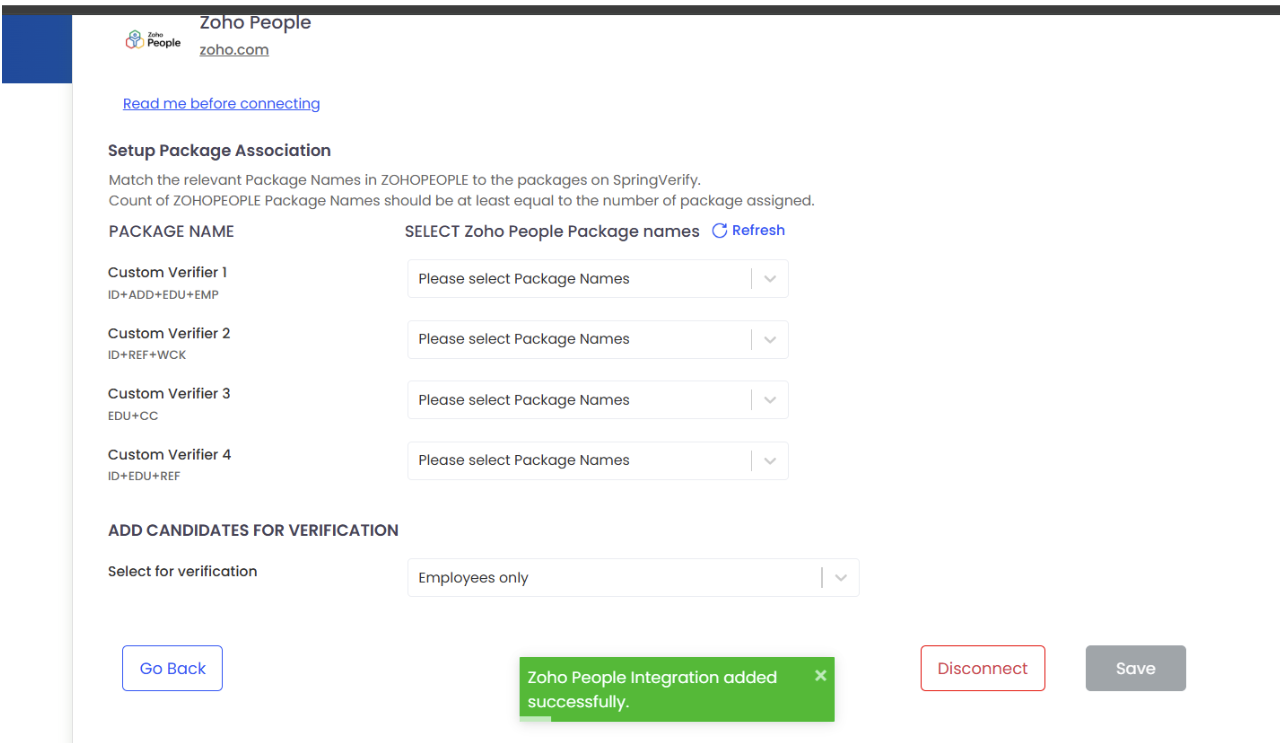 You will be redirected to the SpringVerify Integrations page with a confirmation message: "Zoho People Integration added successfully." Next, map the packages relevant to your organization to the package names displayed in Zoho People and select the verification from the