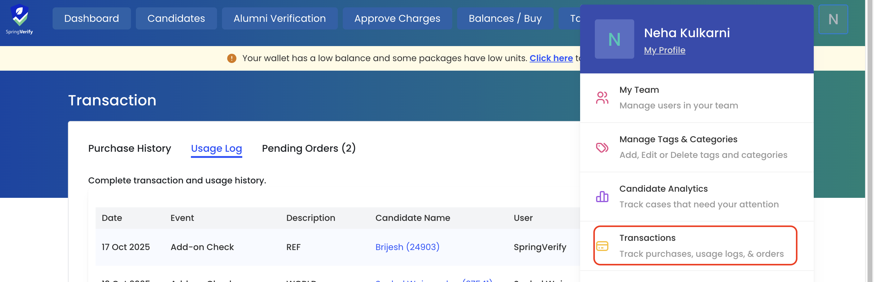 Navigate to the “Usage Logs” for the complete transaction and usage history.