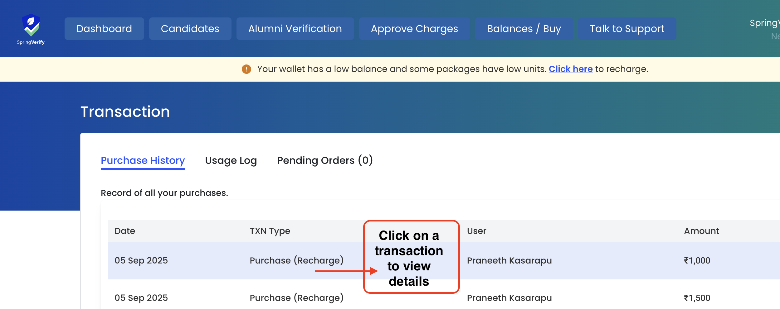 Click on “Purchase ( Recharge)” against the required transaction to view the details.