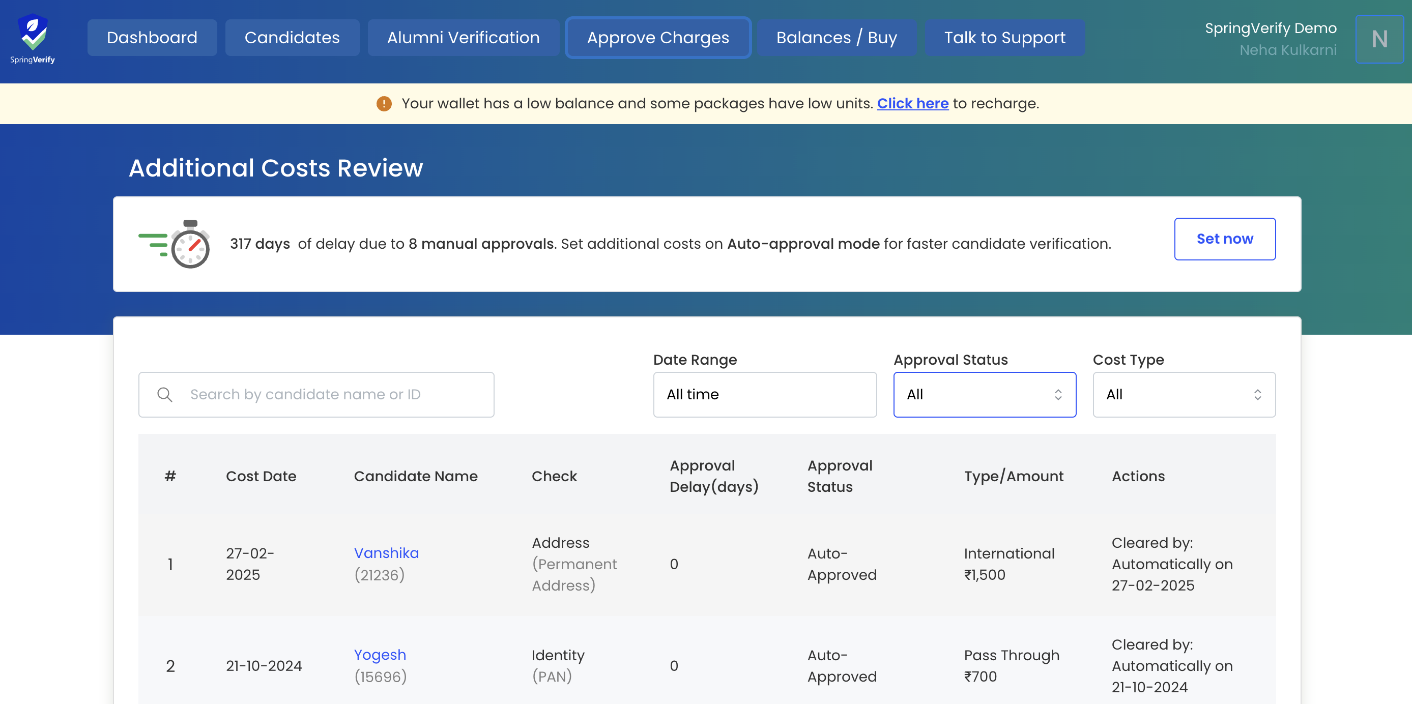 What is an additional cost? Additional costs are the charges that either a university or the ex-employer charges SpringVerify to provide us with the candidate’s data. These additional costs will get Charged by the universities and companies who hire ...