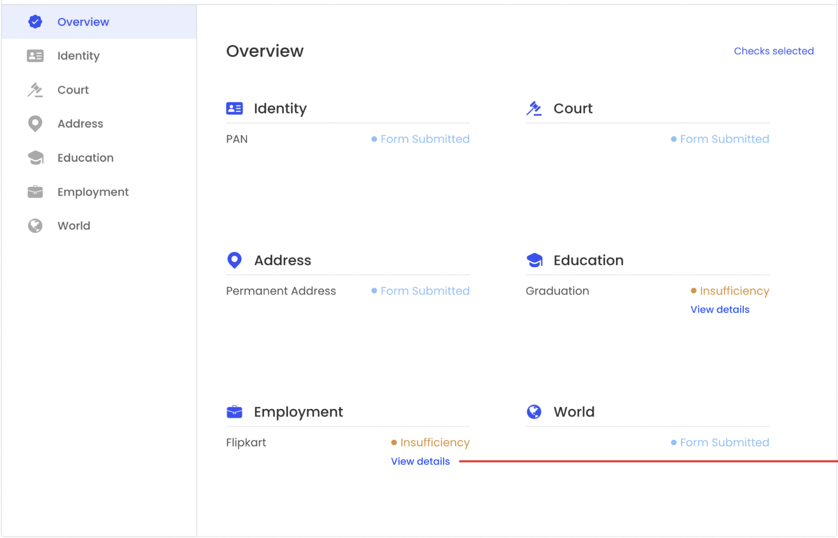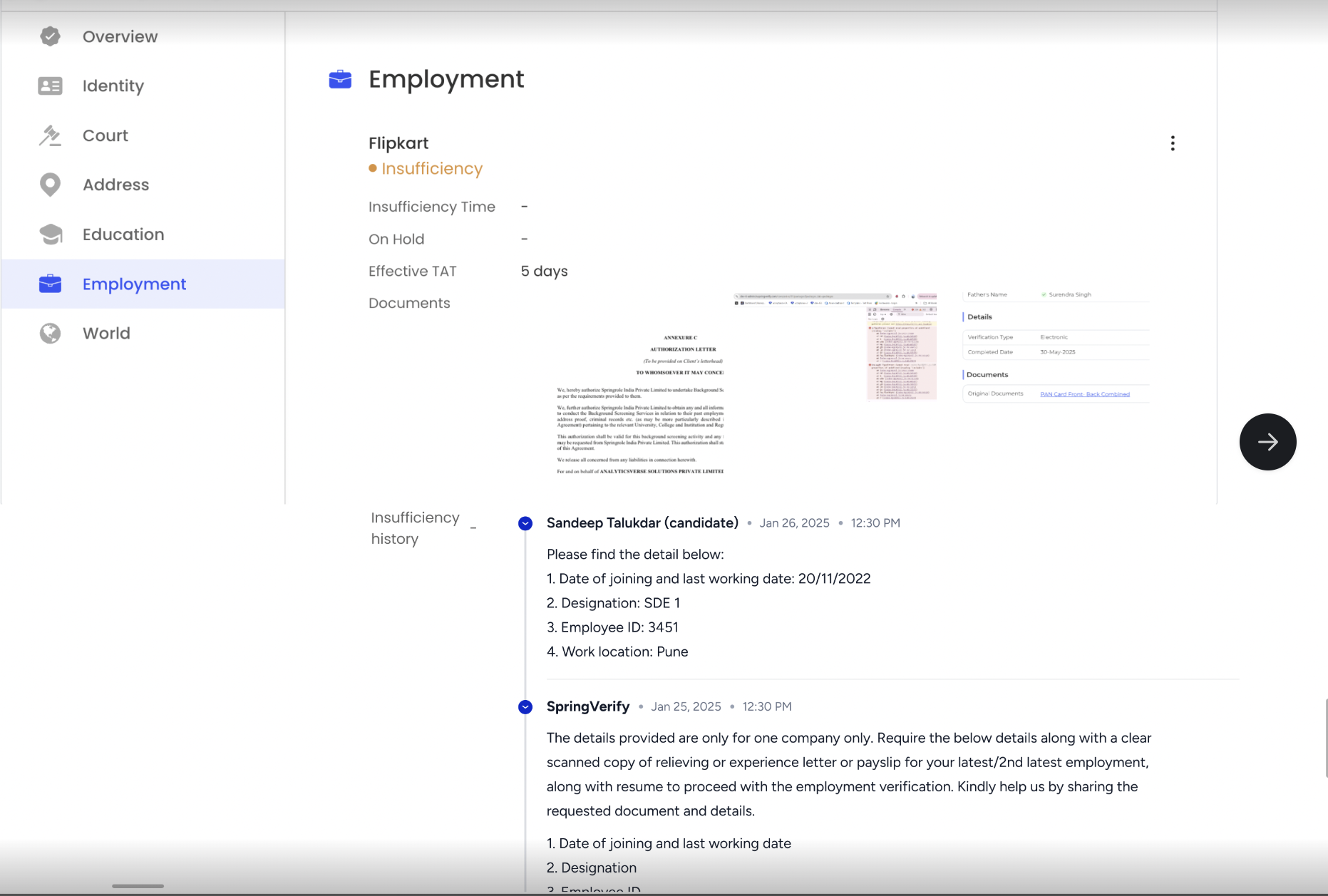An insufficiency is raised when a candidate does not provide sufficient information or documentation for a verification check. When this happens, the Operations team raises an insufficiency requesting clarification or additional details from the candidate.